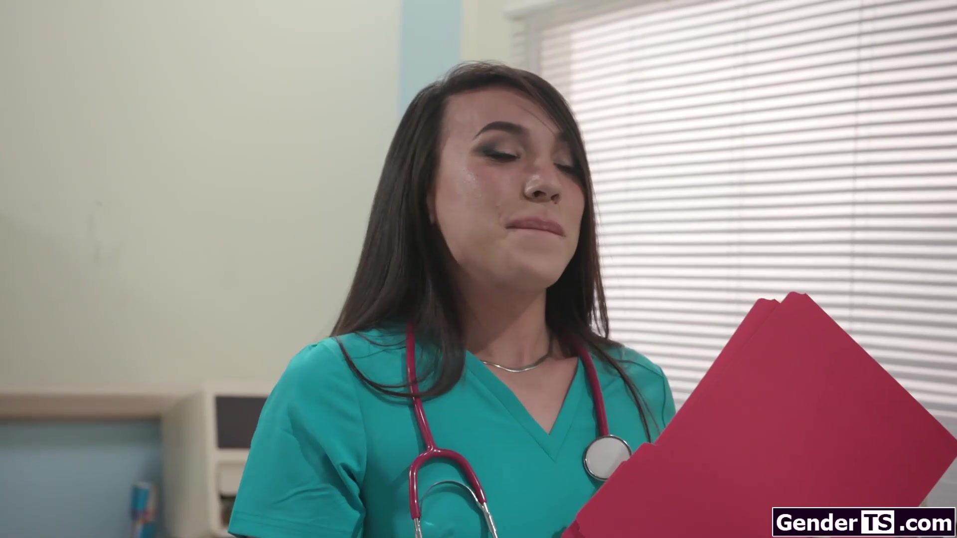 Asian shemale nurse Kasey Kei has the hots for her flirty patient.The small tits tgirl kisses him.The trans gives a double handjob and deepthroats his big hard cock.The guy rims the brunette trannys ass before she bareback anal rides his dick