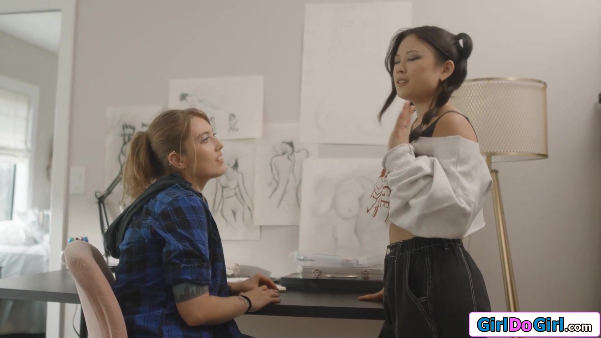 Small boobs coed Lulu Chu make it clear she has set her mind on seducing her former big tits babysitter Electra Rayne and they kiss.The busty babe licks the petite Asians pussy before bending over to get fingerfucked.The lesbians scissor each other
