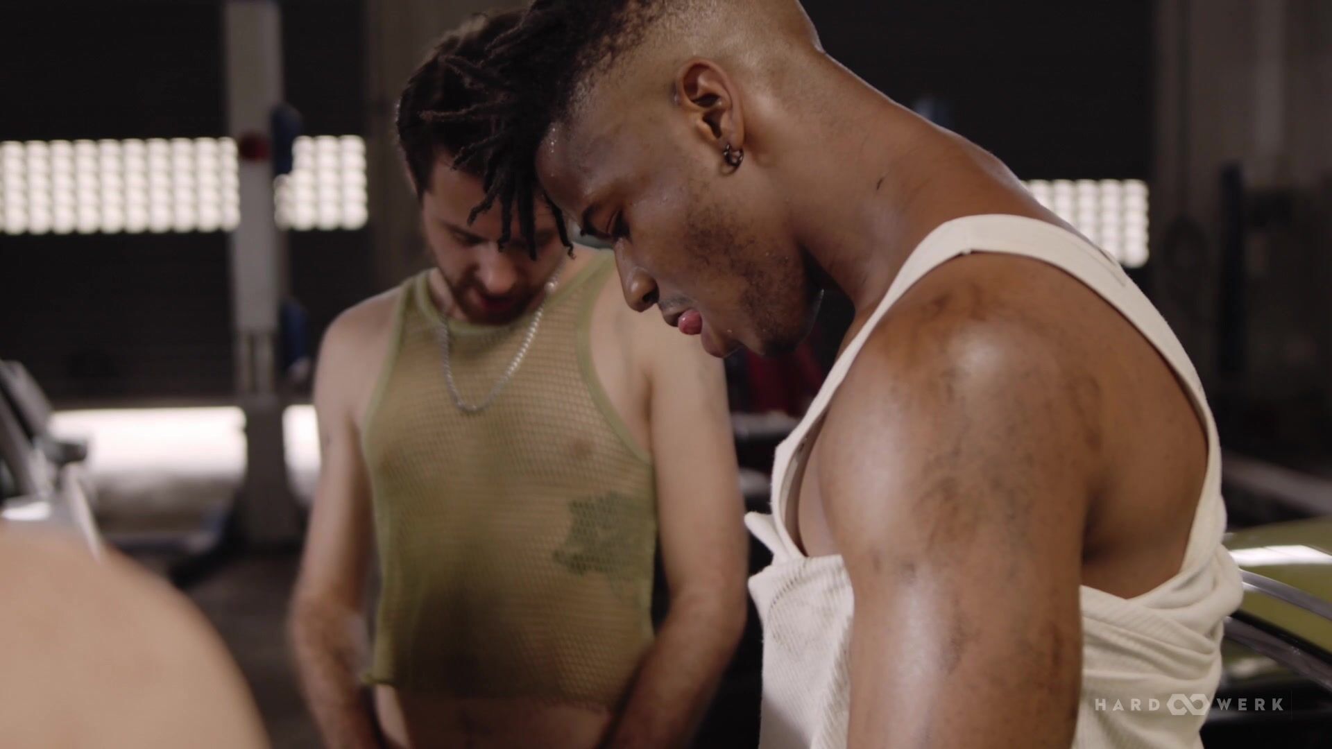 Gabi Gold drove into the car shop to the gawking stares of its assembled greasy gearheads. Within minutes, she was pleasing all four men!