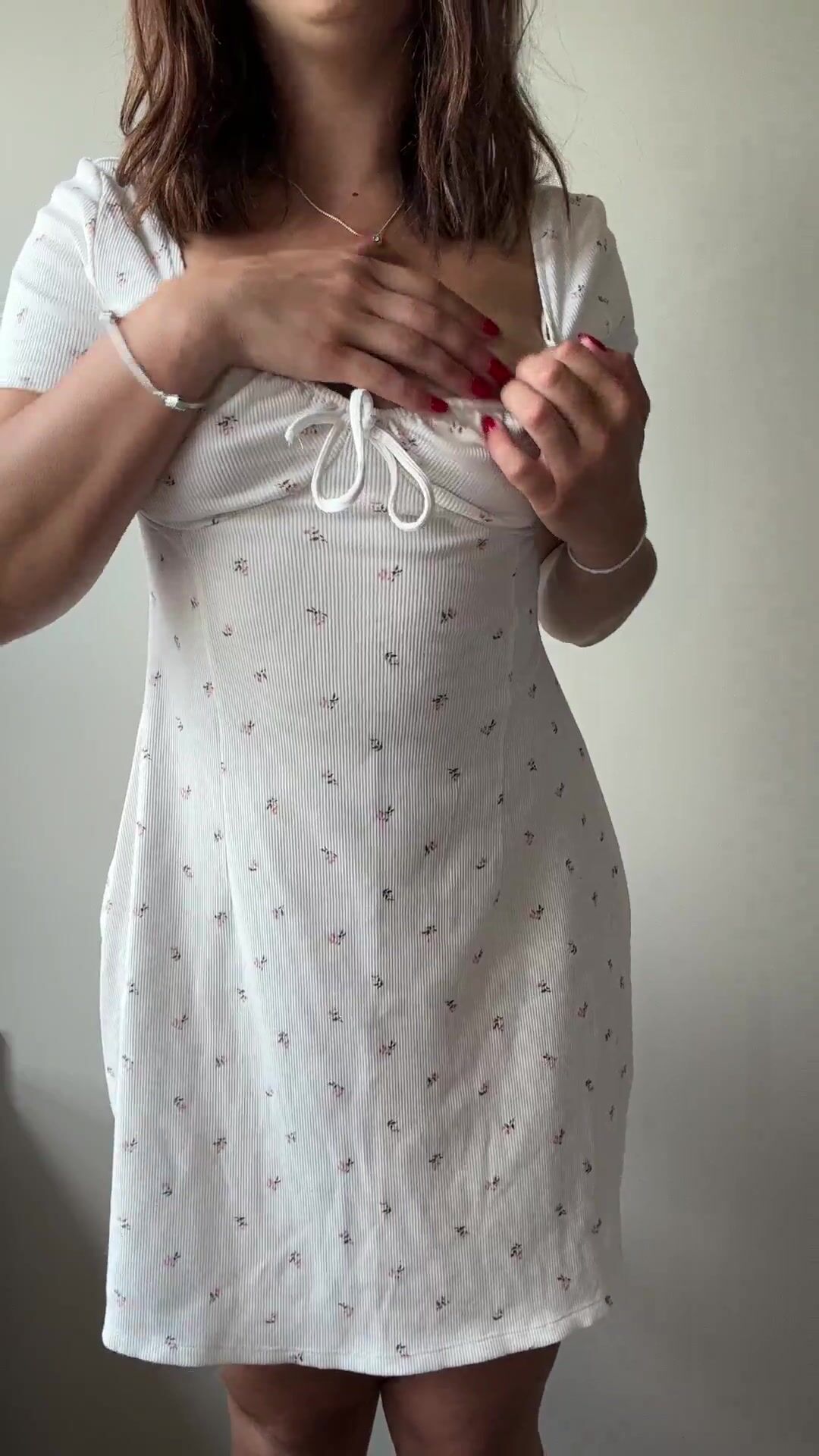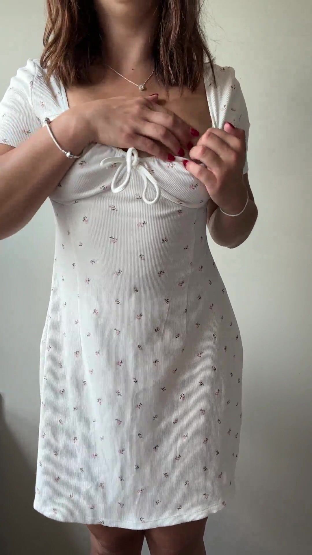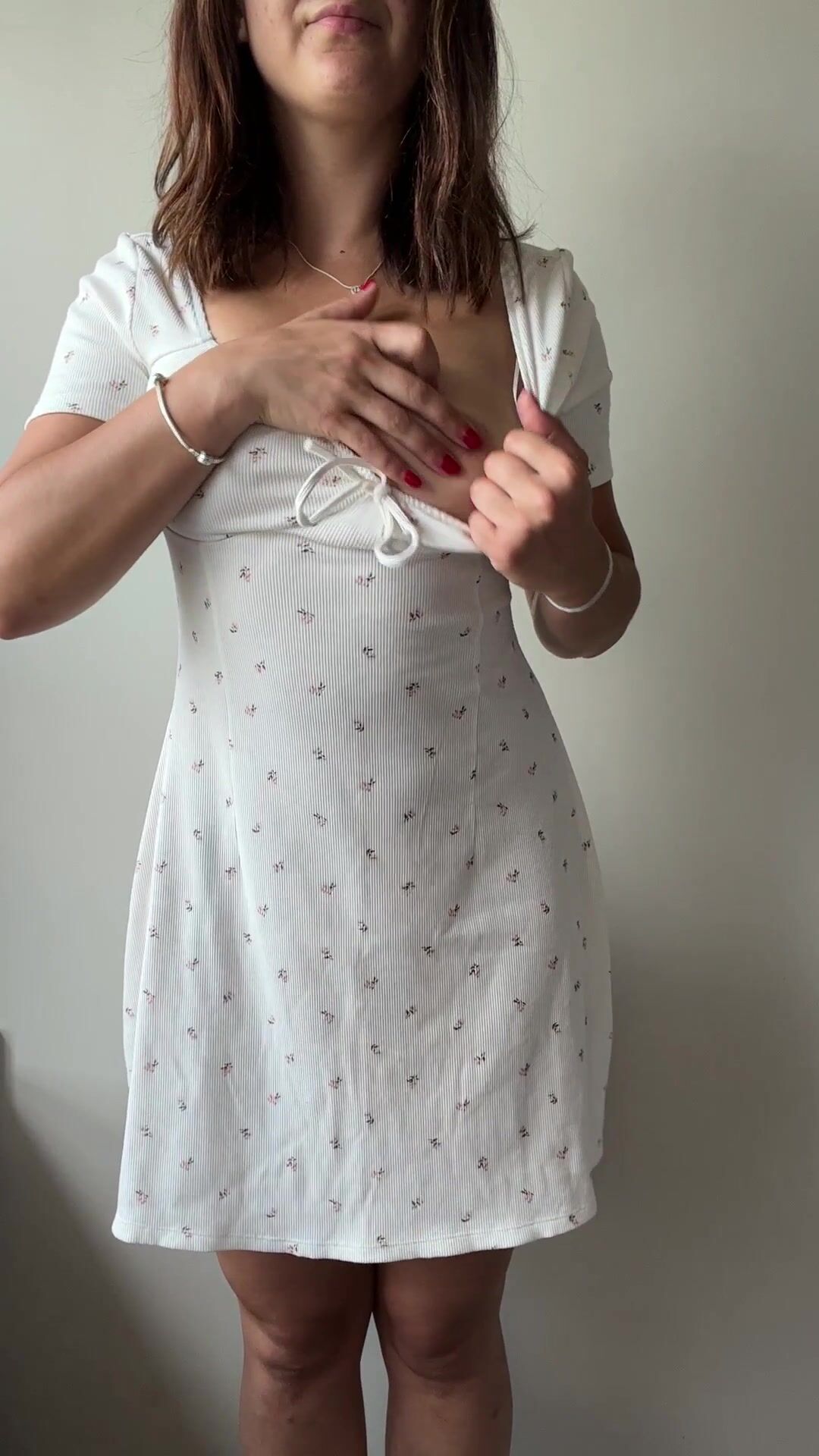 A curvy petite in her white floral dress flaunting her natural tits