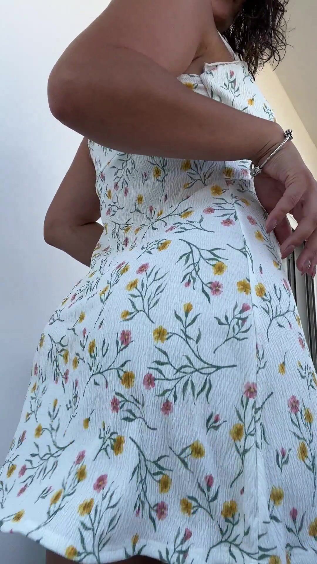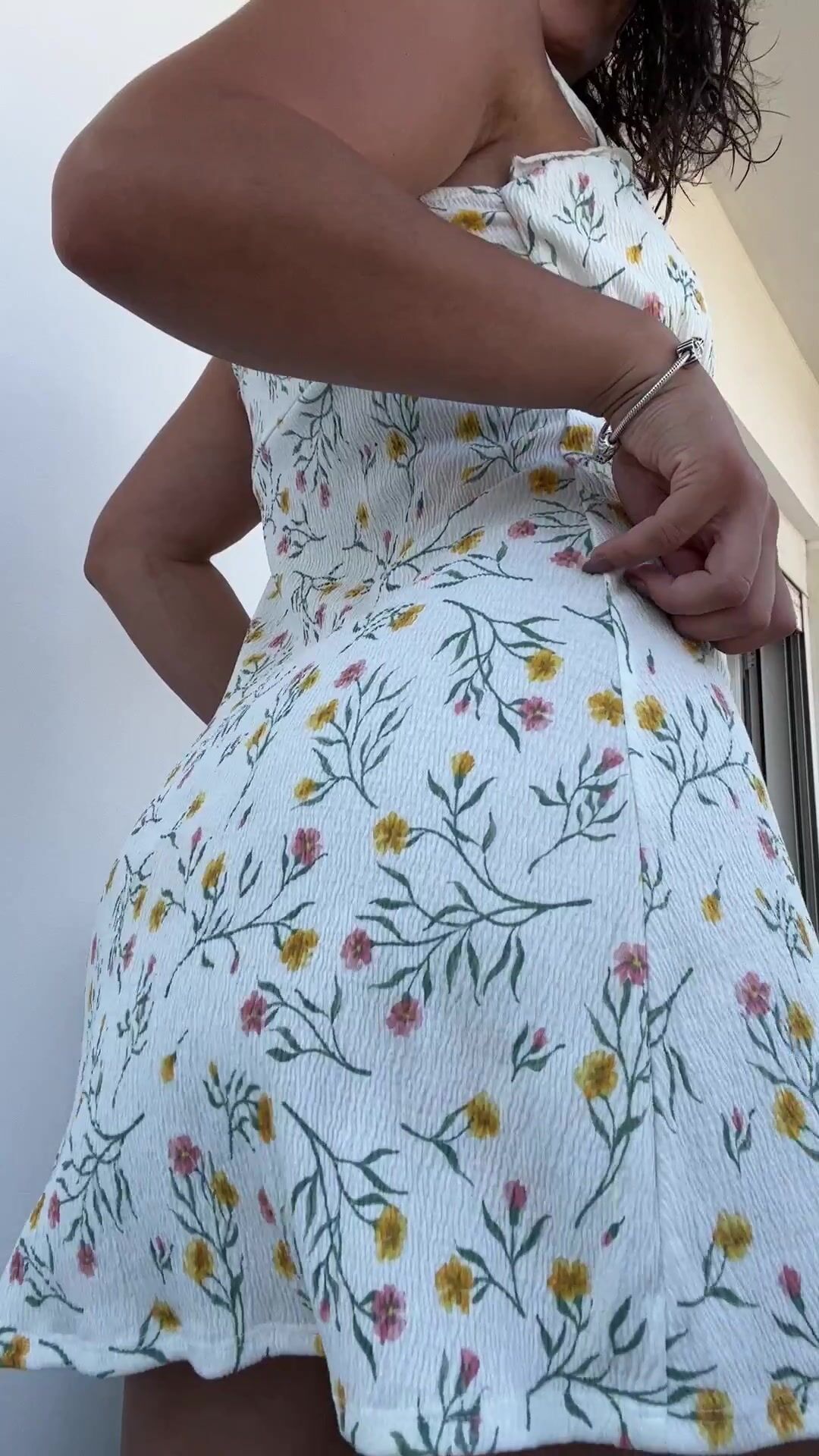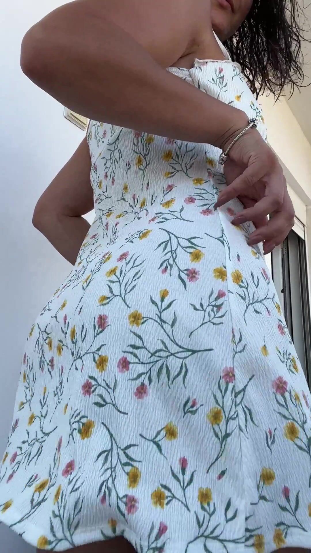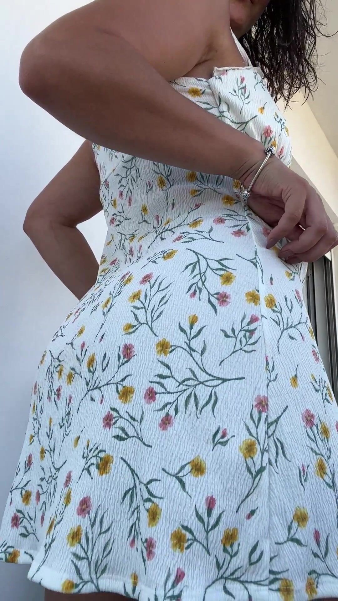 hot wife in her white floral dress getting fresh air outside freeing her butt cheeks