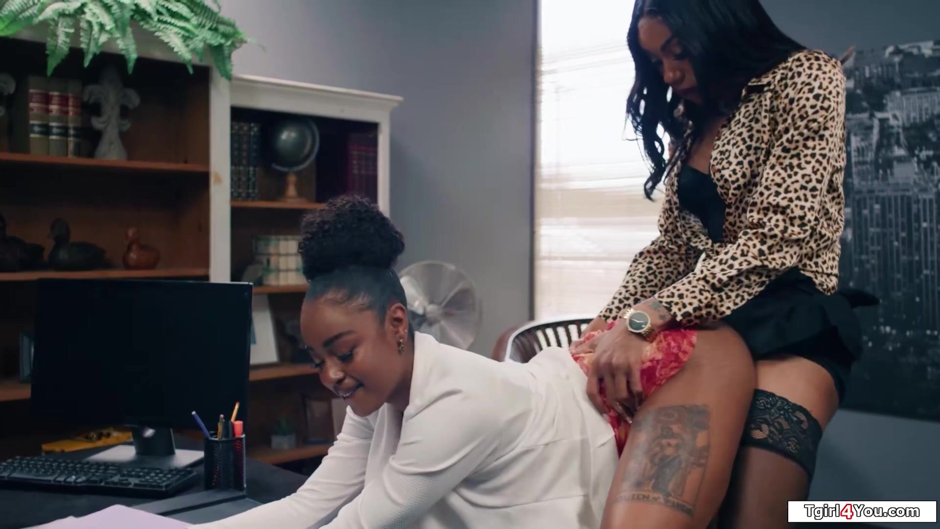Busty ebony tgirl Leilani Li puts her tranny dick in her black boss Destiny Miras pussy.The shemale secretary gets deepthroated and is rimmed.The brunette tattooed trans eats the babes snatch on her desk so it wet enough to bang her some more