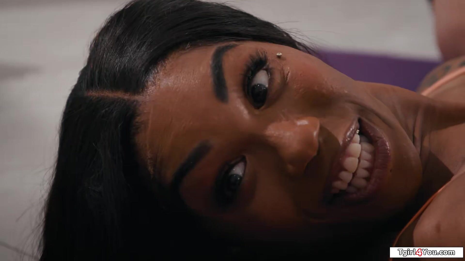 Horny Asian tgirl Kasey Kei rips open busty ebony shemale Leilani Lis pants ifo the yoga teacher.He barebacks the trans while sucking tranny dick.The black ts anal rides his cock with the small tits oriental transsexuals ass on top of her bbc