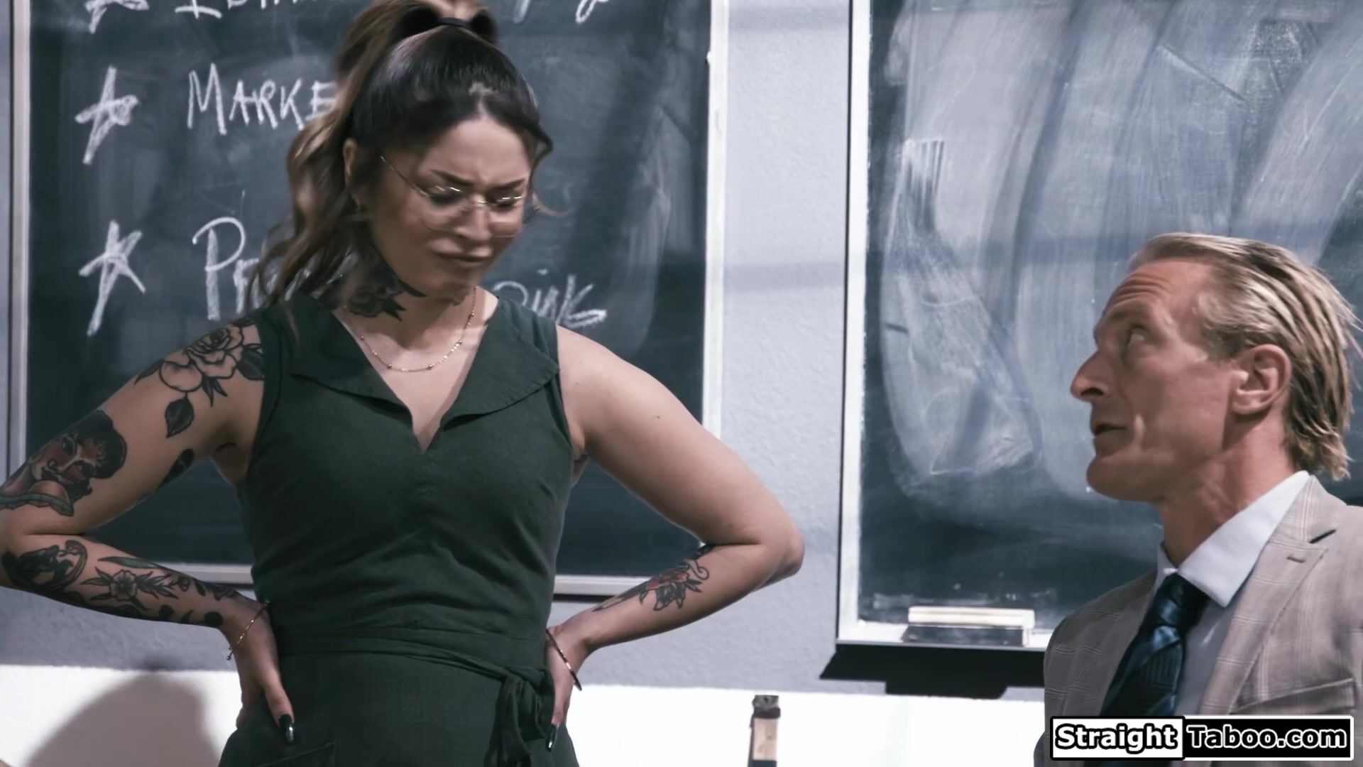 You fucked a lot of students back in the day Mr Harris so why not me.Latin Vanessa Vega is clear on what she wants and makes her old teacher lick her pussy on his desk.The small tits petite tattooed latina gives a sloppy blowjob before getting banged