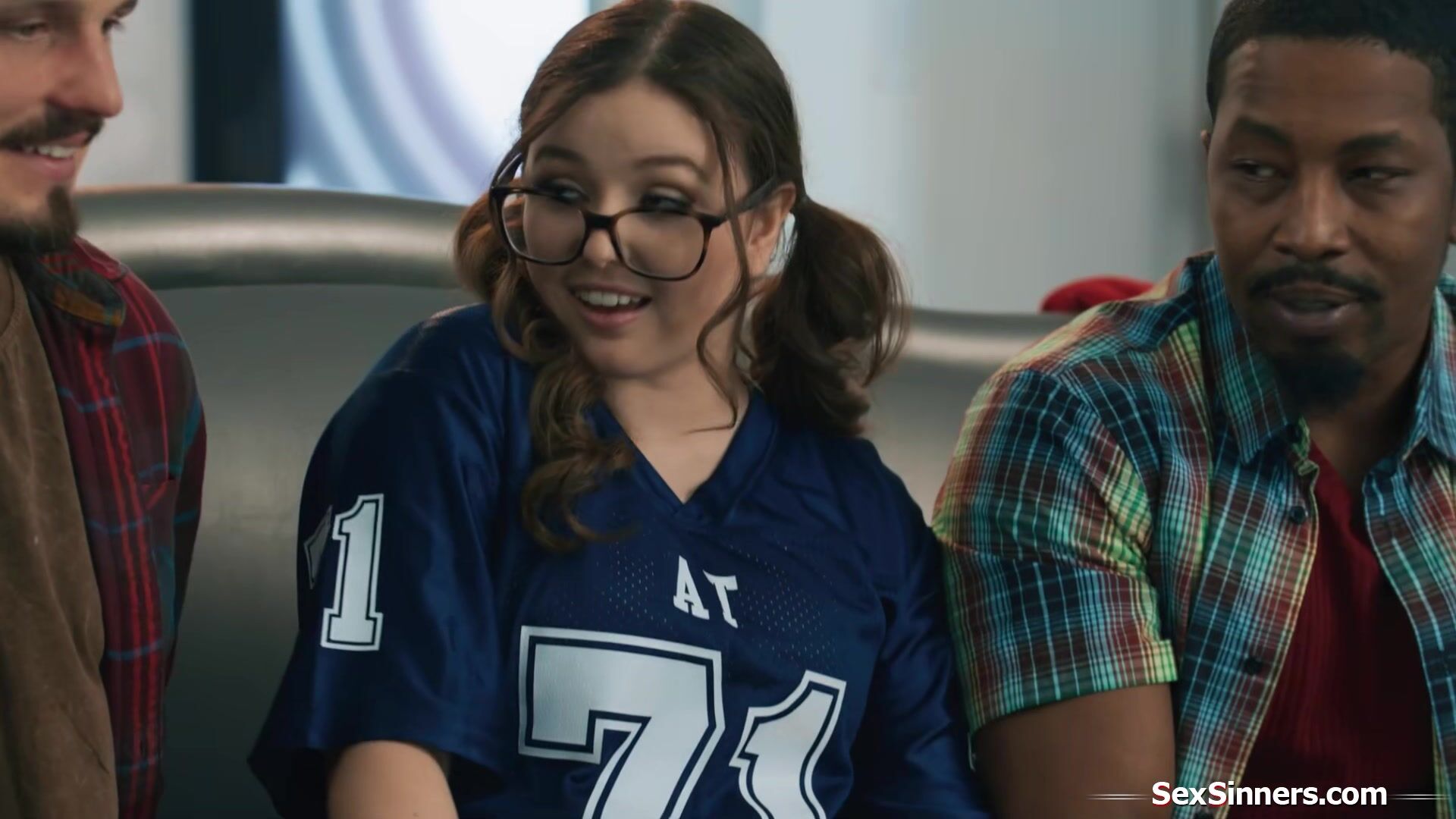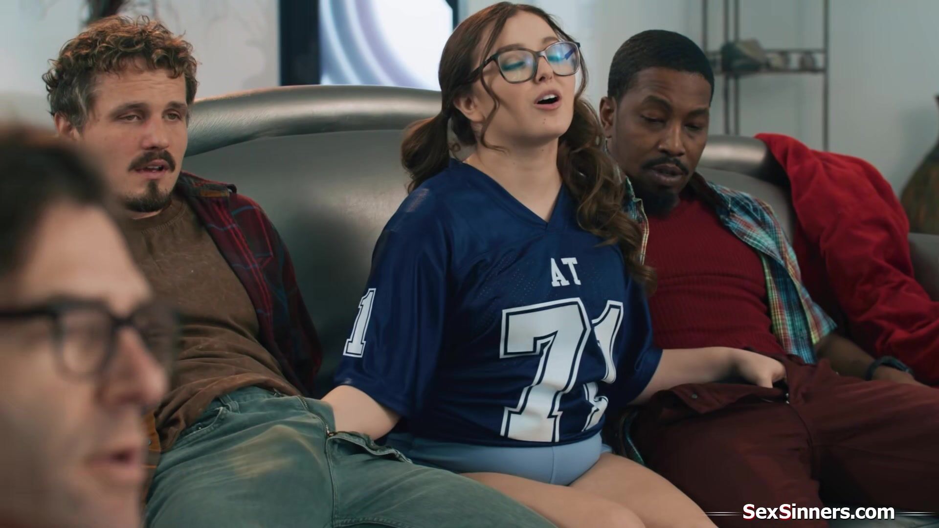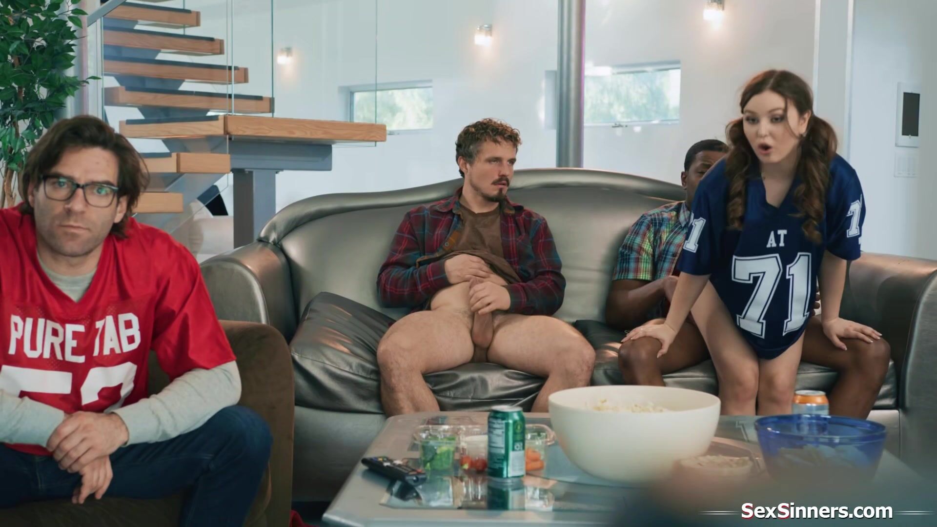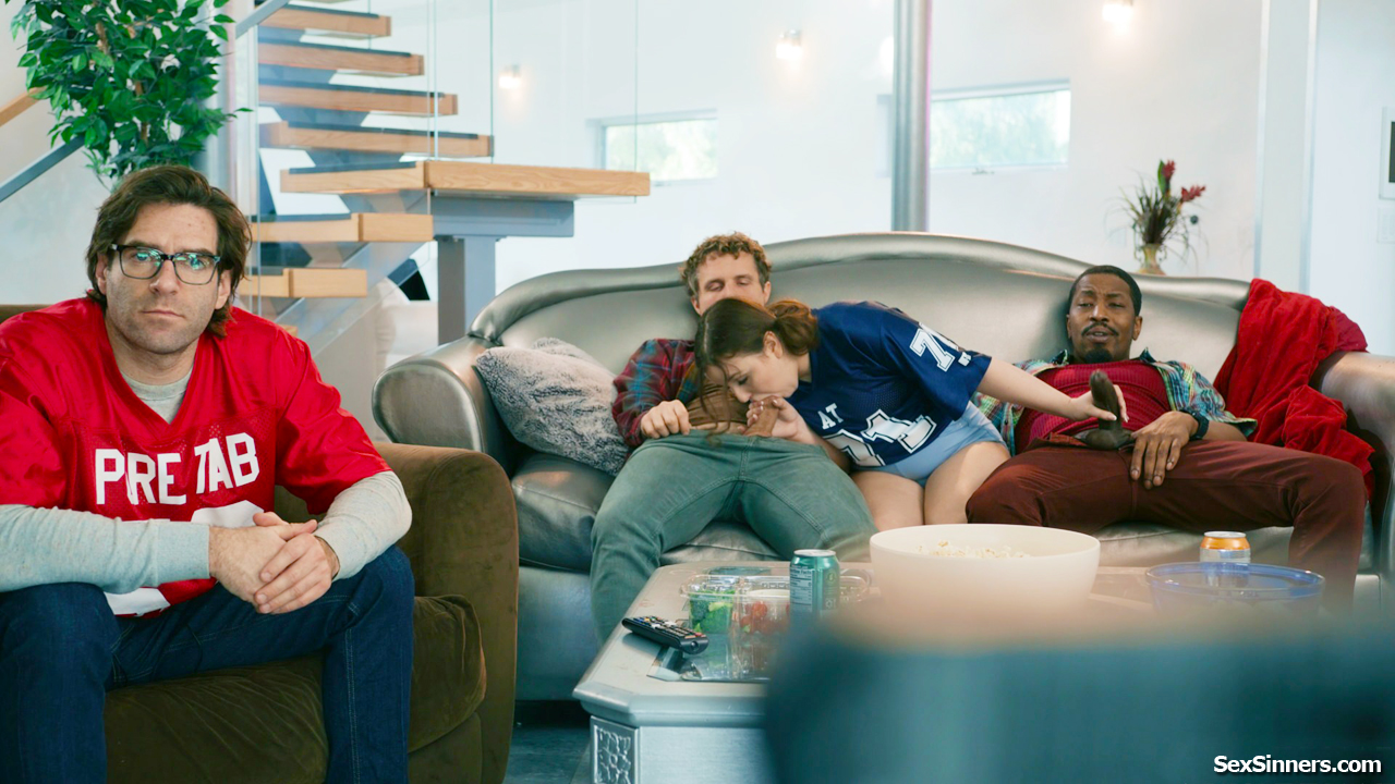 Stepdaughter Leana Lovings sits between her stepdads two friends and starts to jerk them off behind his back.The petite teen sucks them both and rides the guys big black cock.During half time they have a minute to really fuck the horny brunette