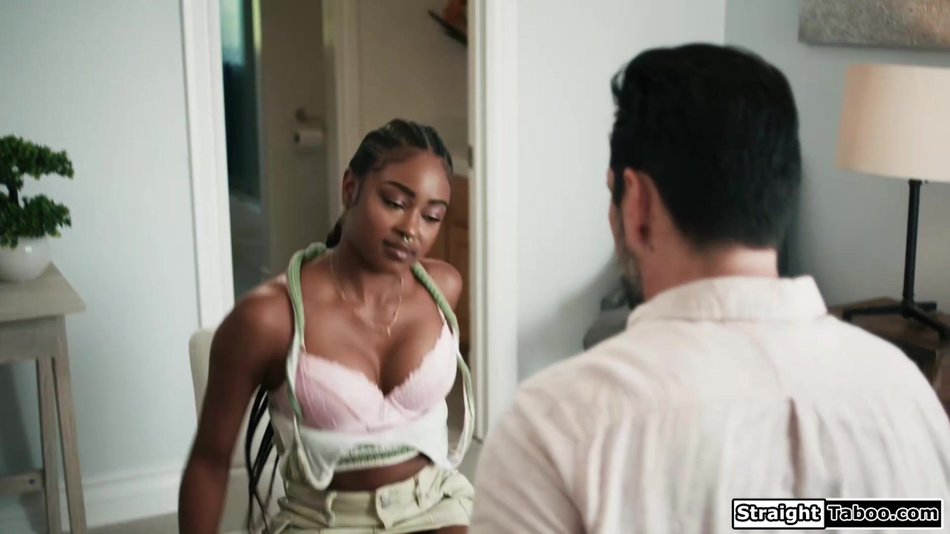 Stepdad is caught spying on his ebony stepdaughter Destiny Mira so she makes him watch her masturbate.The black babe gives her stepdaddy a footjob and gets her shaved pussy licked.The brunette deepthroats his cock and is fucked until she squirts