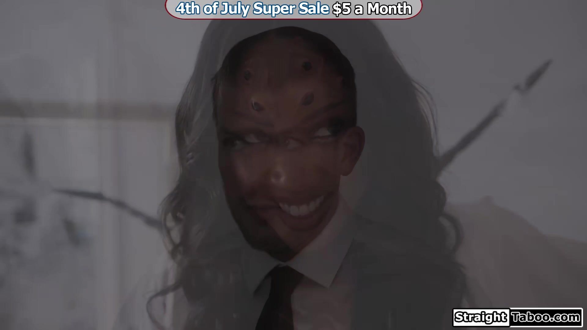 Guy is shocked to see his busty ebony wife August Sky has turned into a spider monster and is on top of her cocooned teen neighbor.The black milf will think about releasing him if she can suck both of their big cocks.The guys fuck the monstrosity