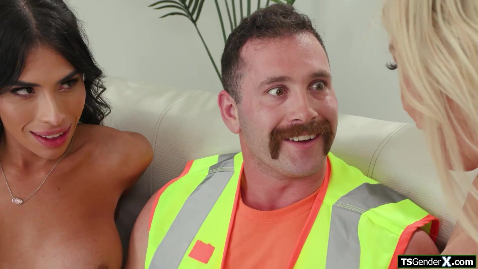 Busty shemale Aubrey Kate and latin trans Avery Lust has set their eyes on a worker.The tgirls suck his cock and reveil their hard tranny dicks.He deepthroats them both.The brunette ts is bareback anal fucked while giving a bj to her transsexual gf