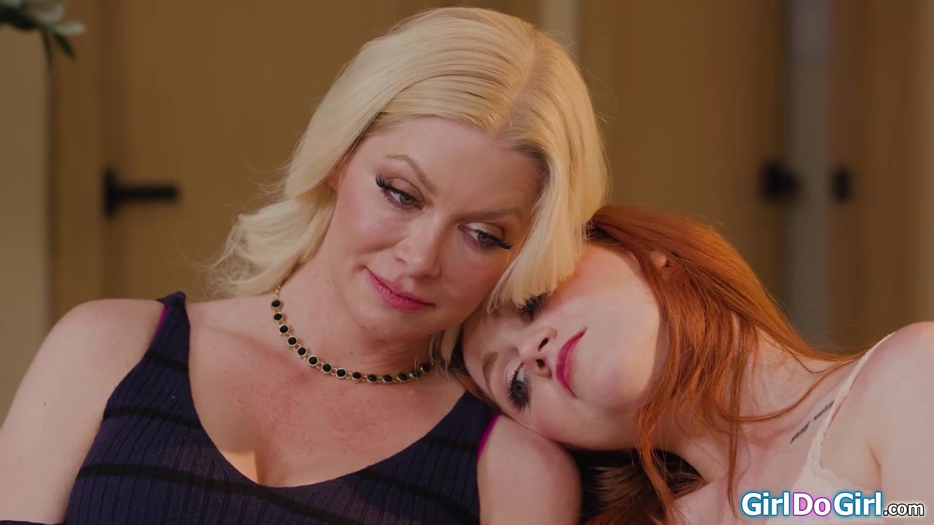 18yo stepdaughter Scarlet Skies want to help her busty stepmom Serene Siren to get over her breakup with her tongue.The redhead sucks on the milfs big tits and facesits her.The lesbians scissor fuck before the small tits teen is pussy licked