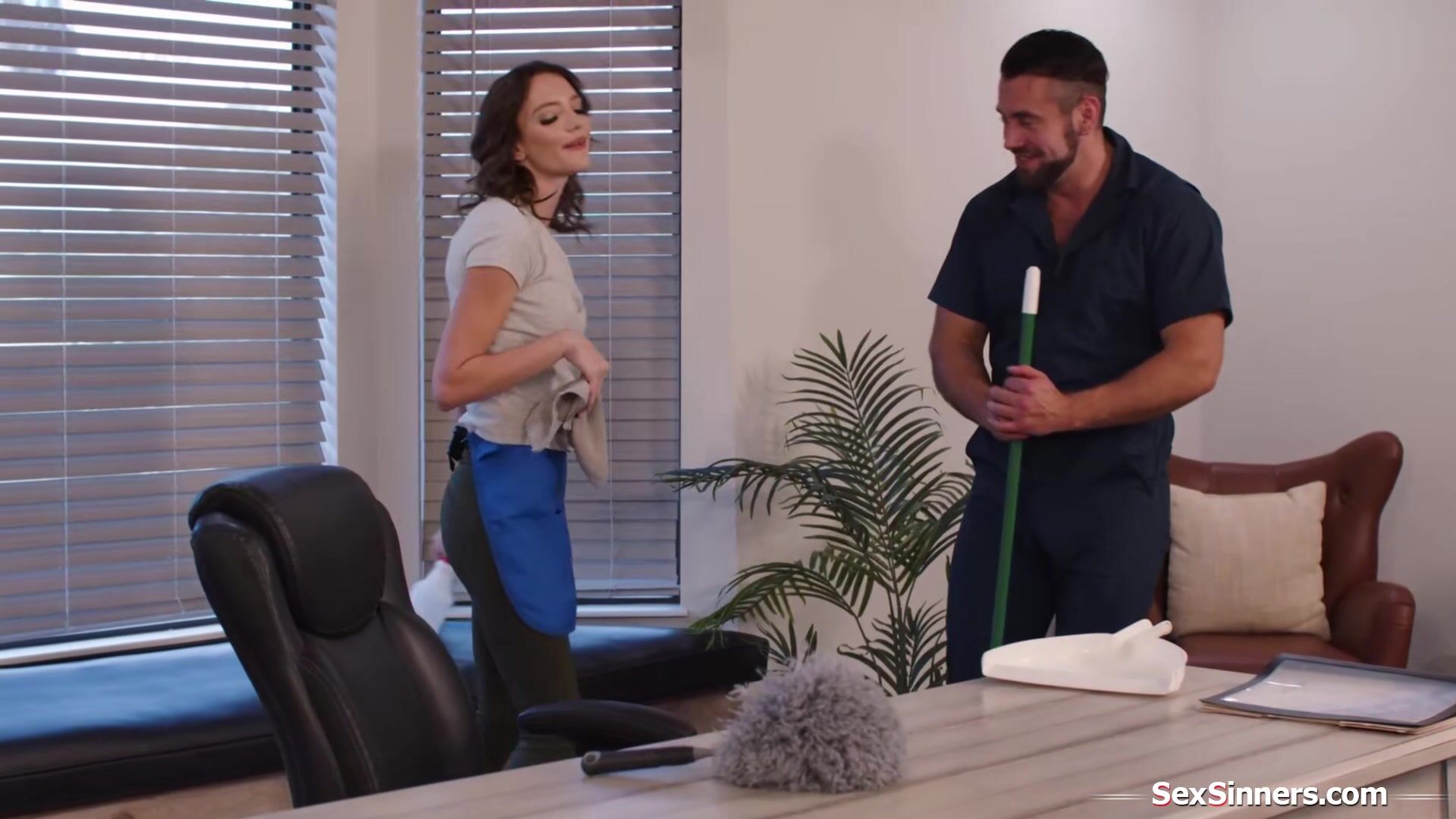 Busty cleaning lady Kenna James and her colleague get caught fucking by their boss and he joins.The big tits brunette gets her shaved snatch licked while shes deepthroat facefucked.The guys put their cocks in her pussy for a double vagina fucking