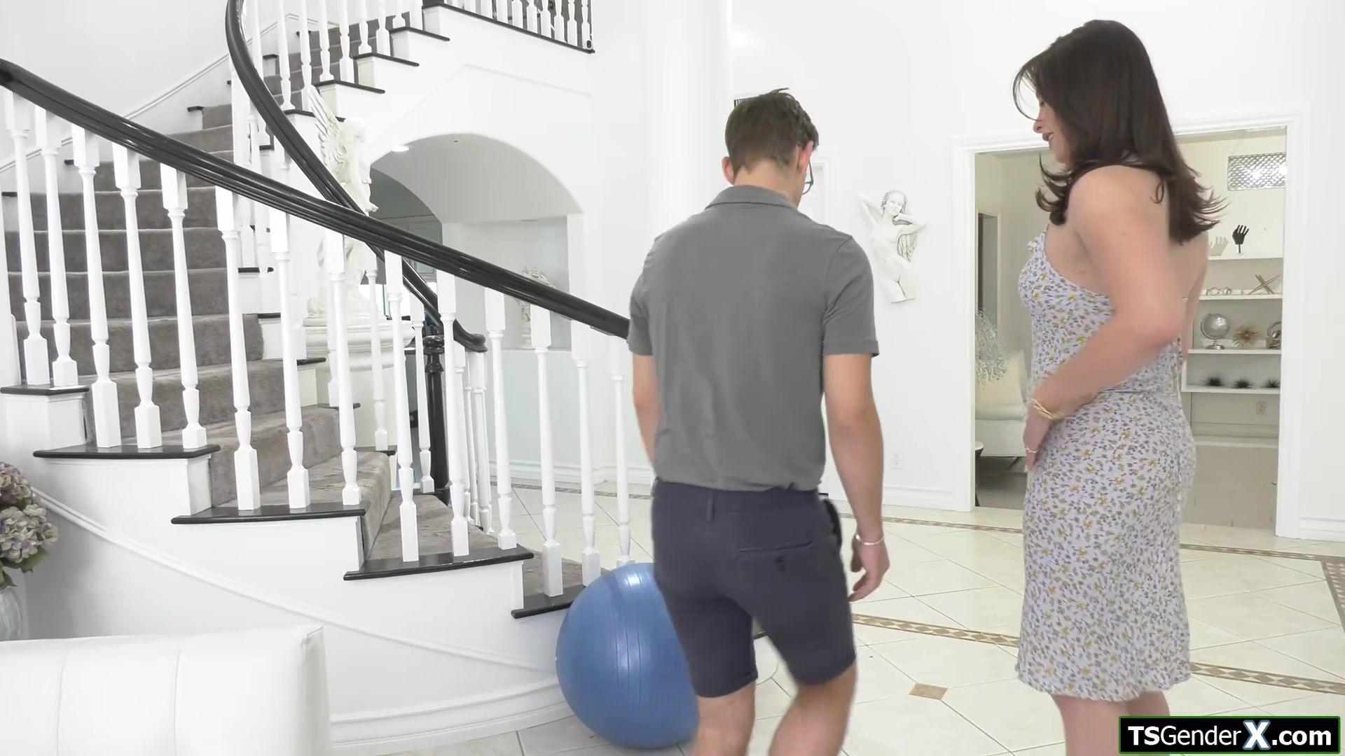 Trans stepmom Alexa Scout helps her stepson working out and notices his cock is growing hard.The small tits shemale takes his big dick out and deepthroats it.The brunette tgirl is anal doggystyled.The horny dude barebacks his tranny stepmommy