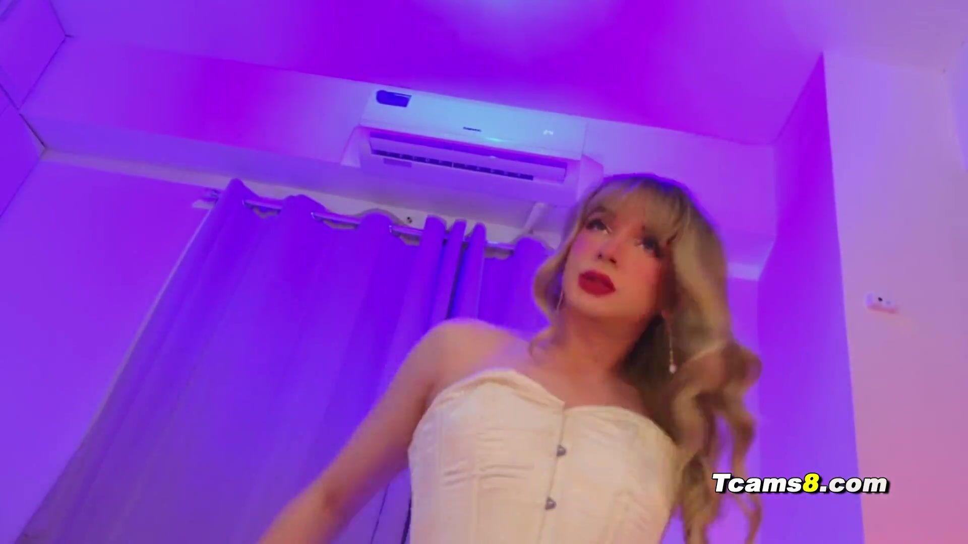 In a lively camshow, two transwomen delight in pleasure. One stands half-naked, her body shimmering under brilliant lights, while the other relaxes in a gaming chair, eagerly reaching for her partner's little cock. For five minutes, she sucks with fervor, lips and tongue in unison, eliciting sighs. The dynamic transforms when the standing transwoman kneels, her mouth encircling the seated transwoman's cock with equal fervor. Their chemistry lights up the screen, with each motion precise and seductive, enthralling onlookers. The intimate encounter, brimming with mutual desire, evolves as they switch roles, their connection tangible.