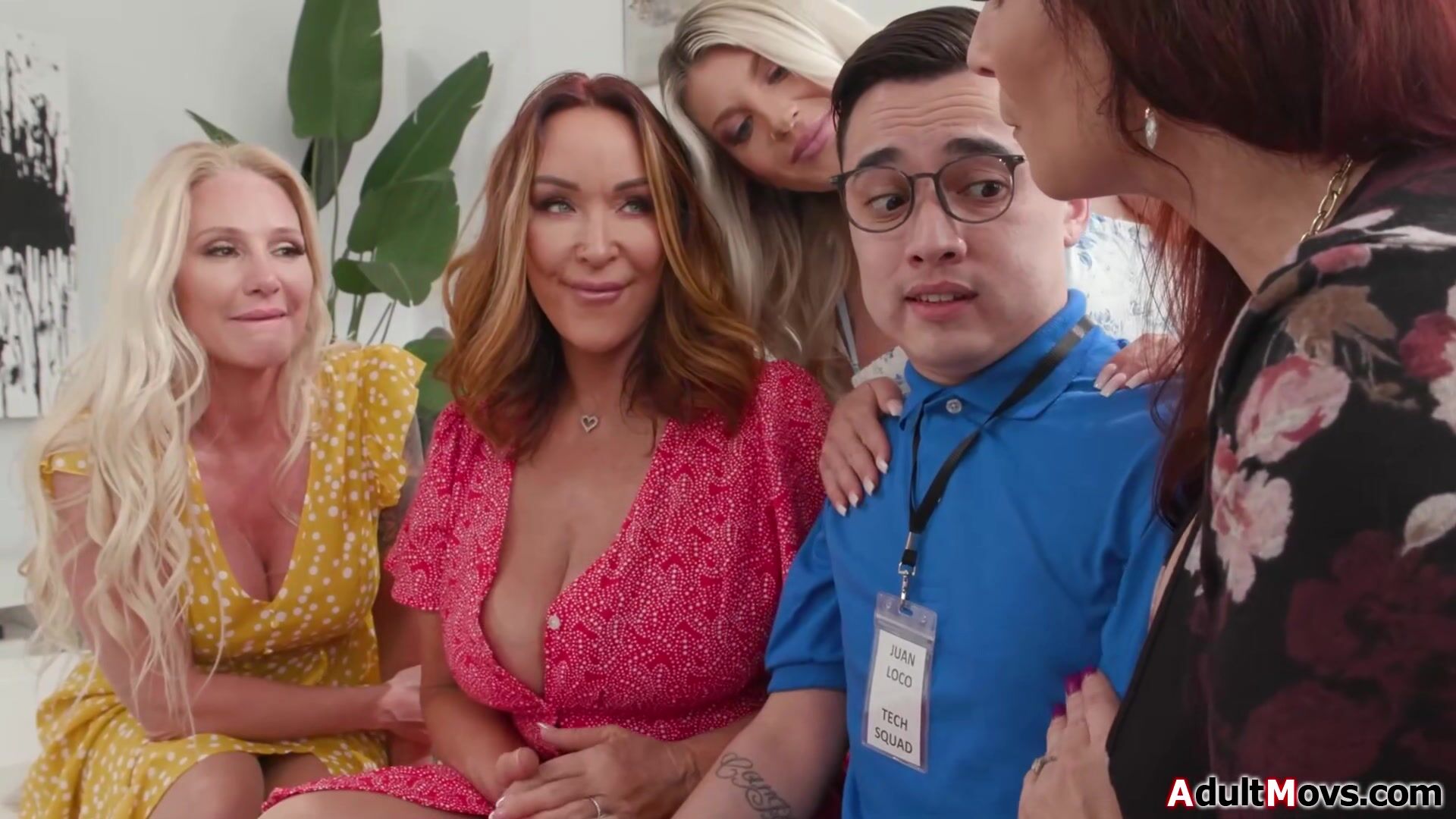 What do you say young man would you help us five horny milfs out?Nerdy tech gets 5 pairs of big tits in his face.The mature babes suck off his big cock.The busty cougars Syren Demer,Alexis Malone,Rachel Steele,Taylor Wild and Linda Lan get fucked