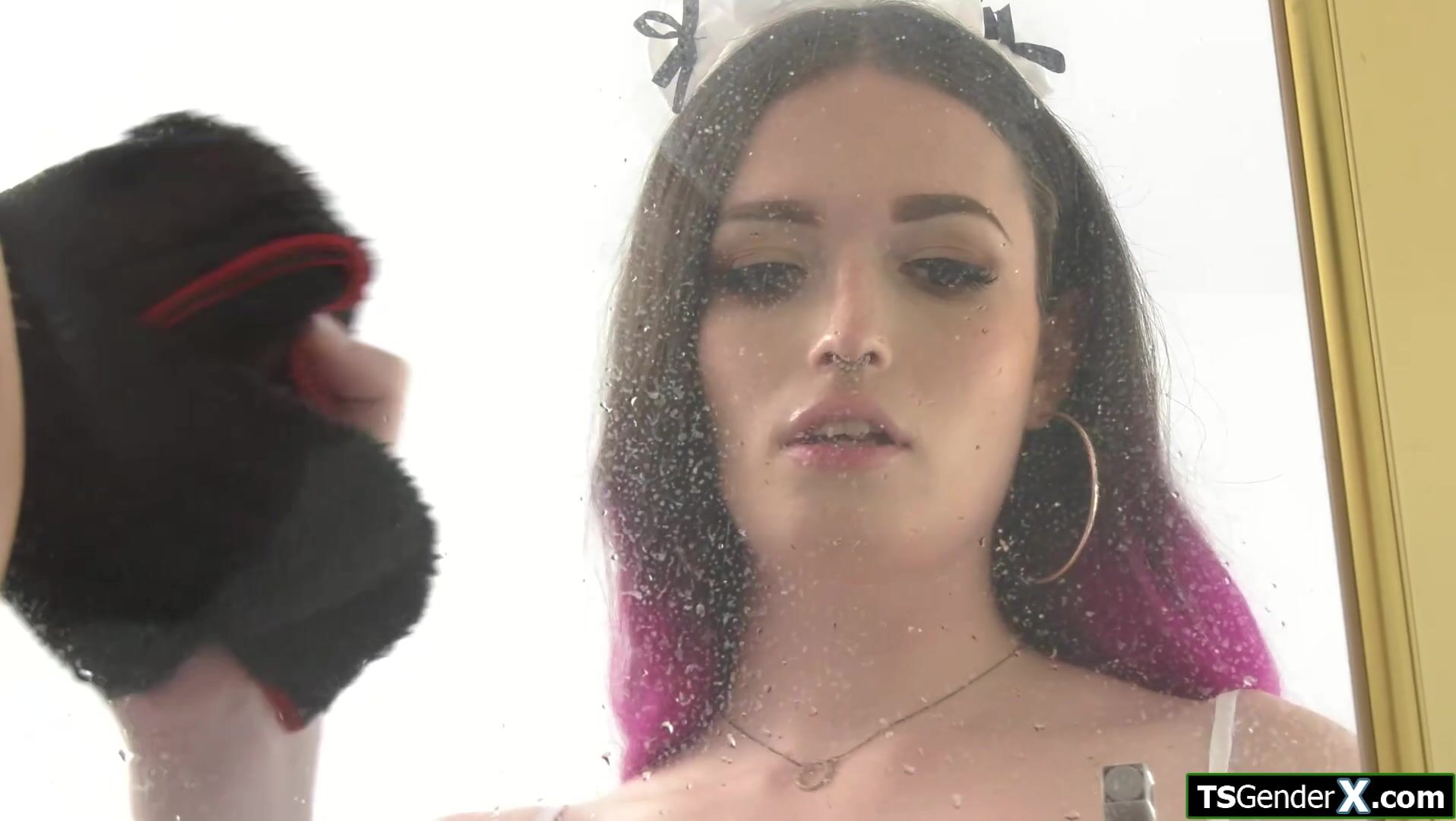 Trans maid Natalie Stone is really impressed by her hung boss when he walks out of the shower.He kisses the shemale and rims her ass.The small tits tranny sucks his big cock and sets her trans asshole on his boner and bareback anal rides