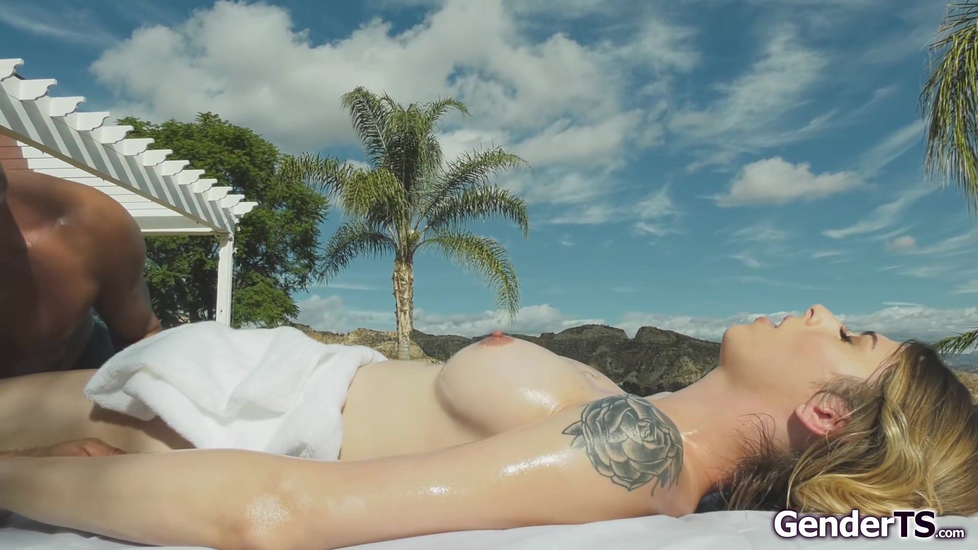 Busty big cock tgirl Casey Kisses enjoys her outdoor ass and boob massage.The big tits shemale gets an oily handjob from her masseur.The blonde trans is jerked off while deepthroating his dick.The tranny is rock hard while being anal barebacked