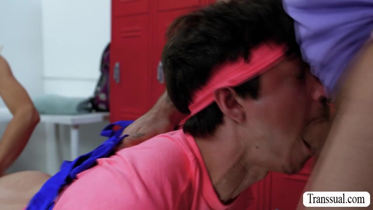 Busty shemale is in the gym with this two dude.After that,they start sucking each others hard big cock and then bareback fuck their wet asses so deep and fucking hard.Go to Transsual.com for the full video of this and more.