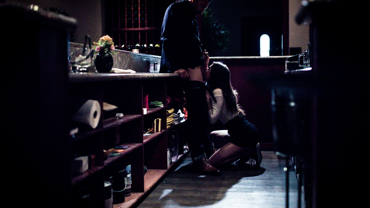 Waitress sucks her boss behind counter