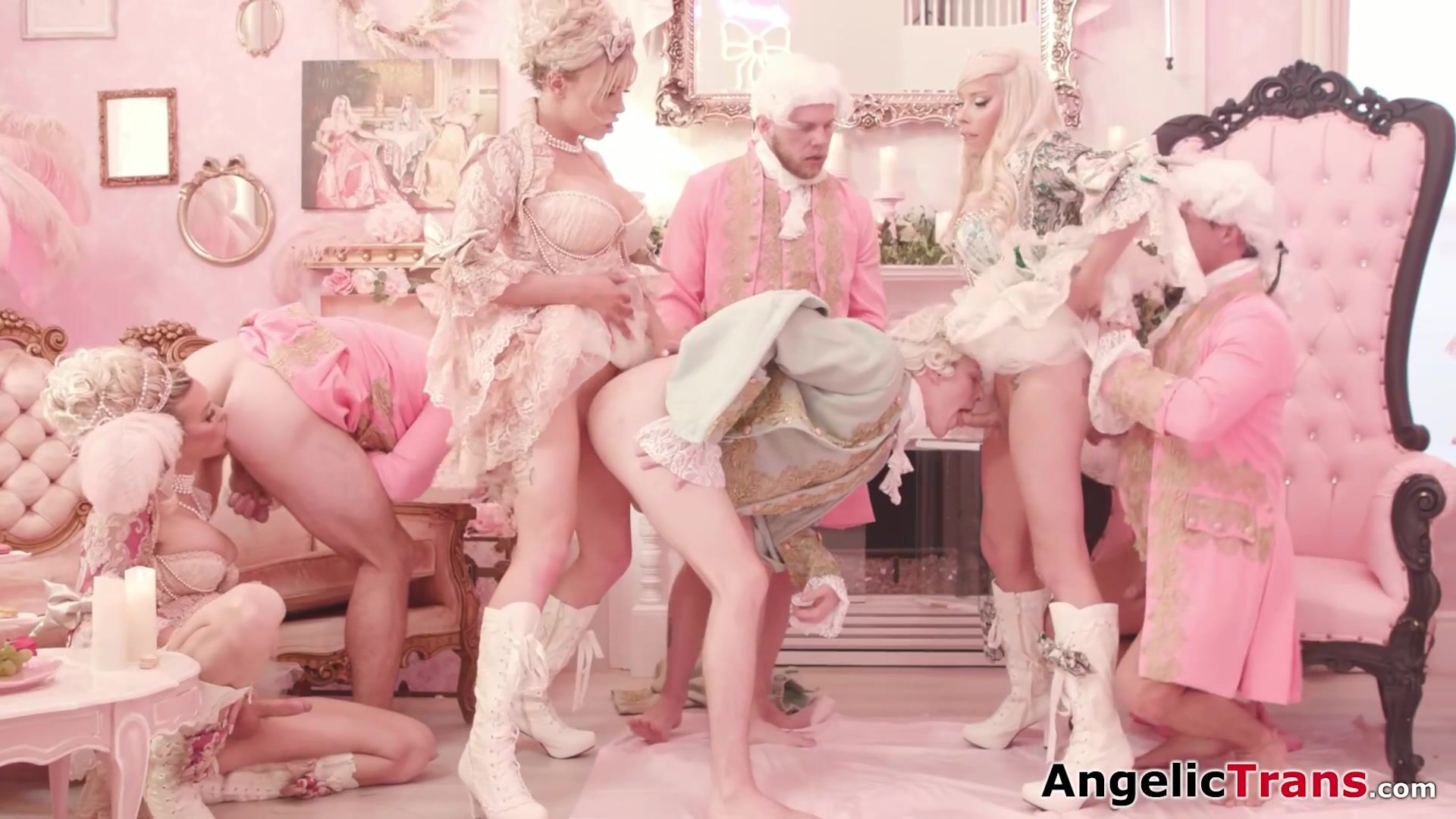 Big tits victorian shemale princesses Aubrey Kate,Brittney Kade and Angellica Good have invited four noblemen and they suck their dicks and getting a blowjob.One guy deepthroats a busty trans while she anal fucked by another big tits tranny