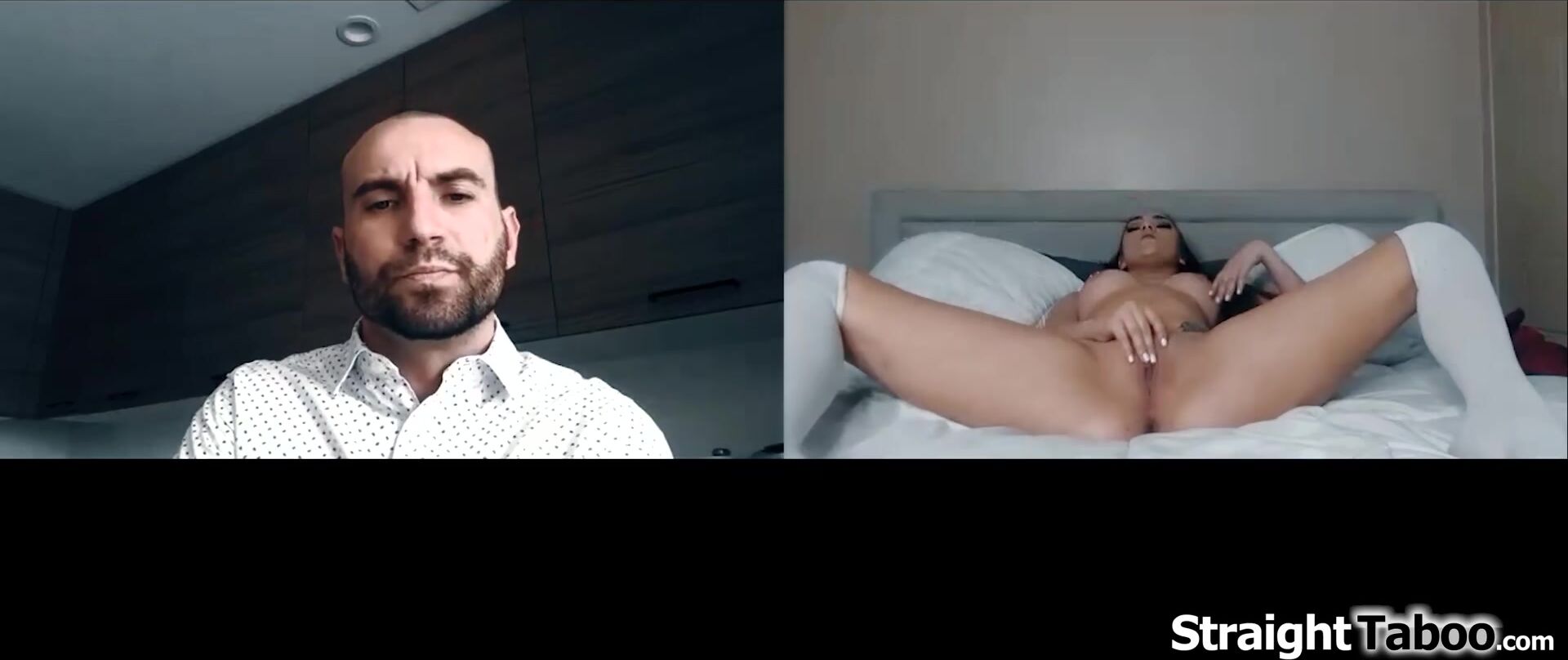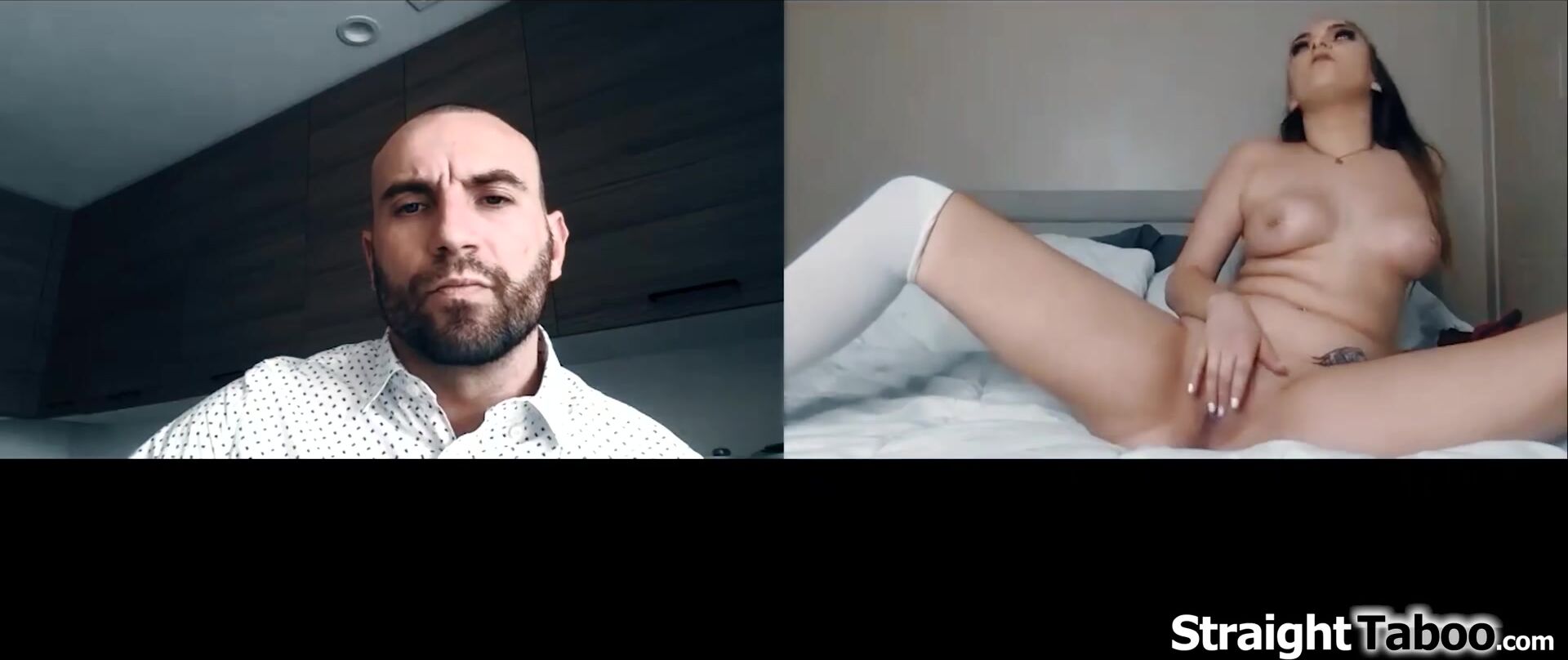 Stepdaughter Athena Faris her stepdad found out she got a tattoo and now wants her to get naked onher webcam to show it.He orders the teen to touch her pussy.The petite small tits teen gets kinda horny and she fingers her shaved snatch for an orgasm