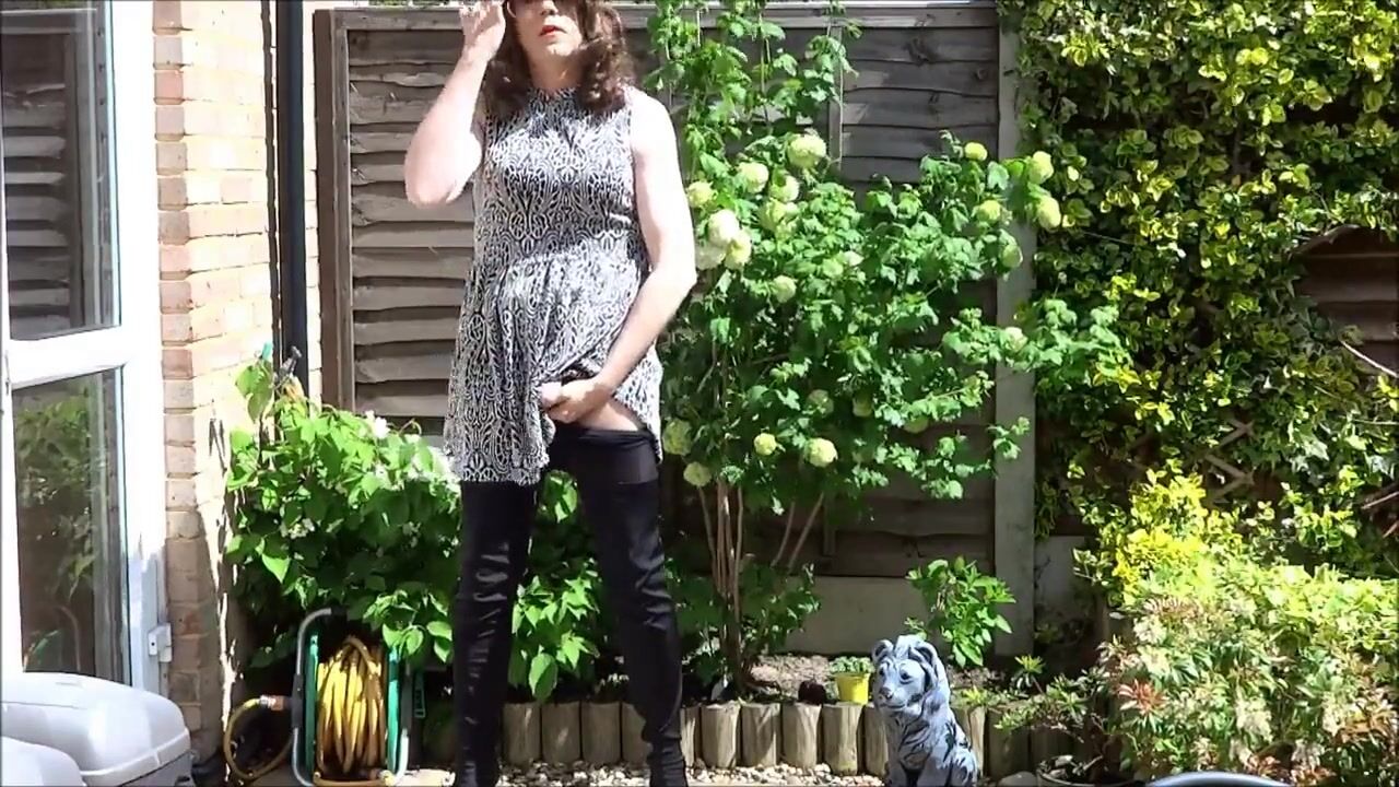 Sexy masturbating crossdresser in thigh boots outdoors