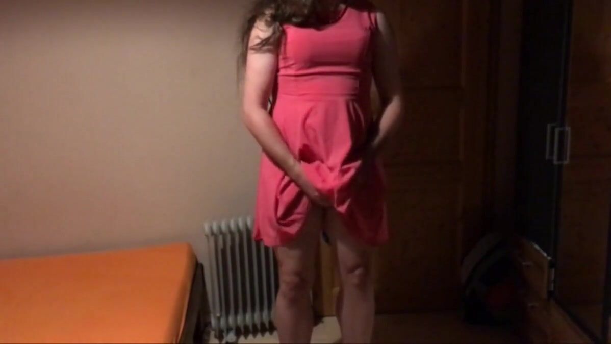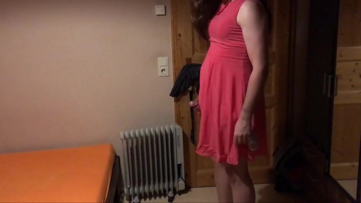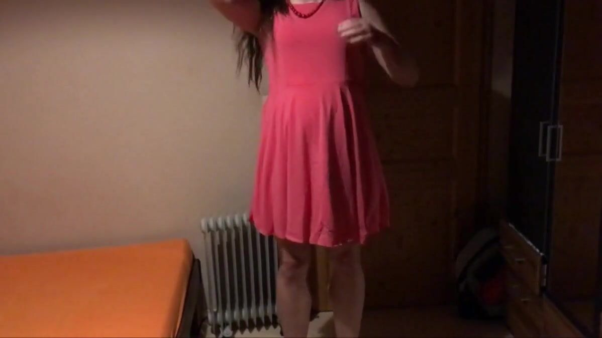 Sissy Carmen shows off her pretty pink dress. After over a week of orgasm denial she is so excited she has to stroke her cock. Cumshot on her face with her eating the cum