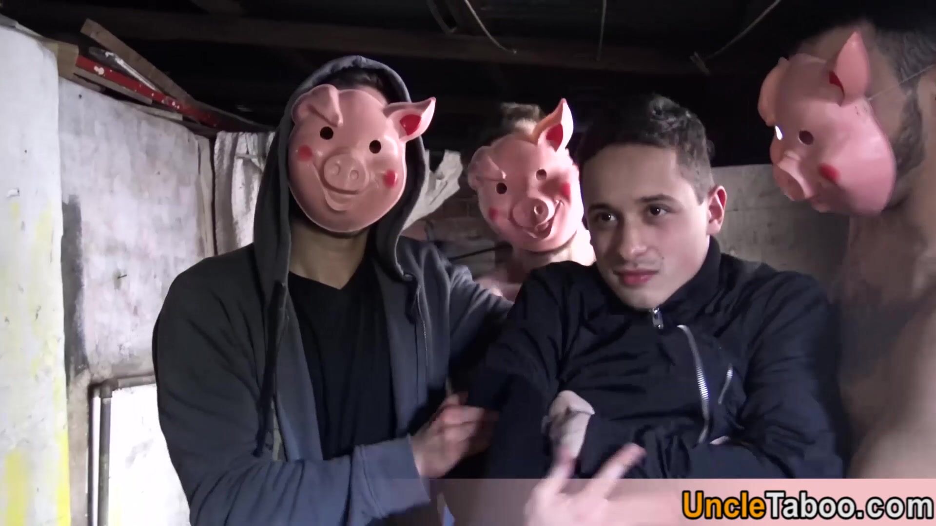 Masked perverted dudes catch a scared teen and take him into an abandoned house where he has to suck their big dick during they fucking him one by one bareback in doggystyle