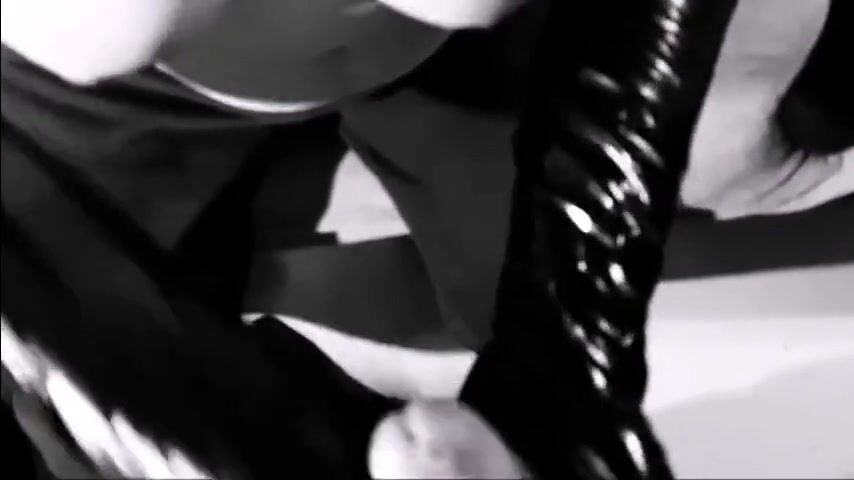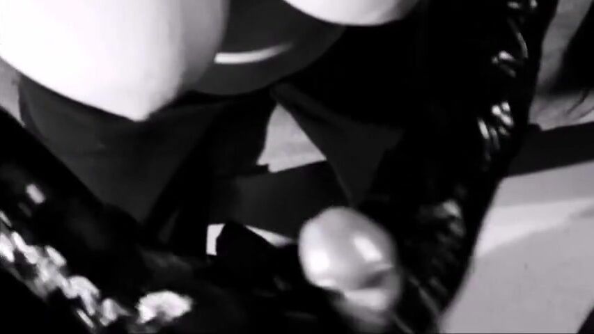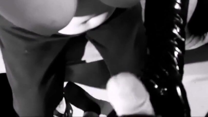 German Milf Simone handjob in black gloves with huge cumshot on saggy tits