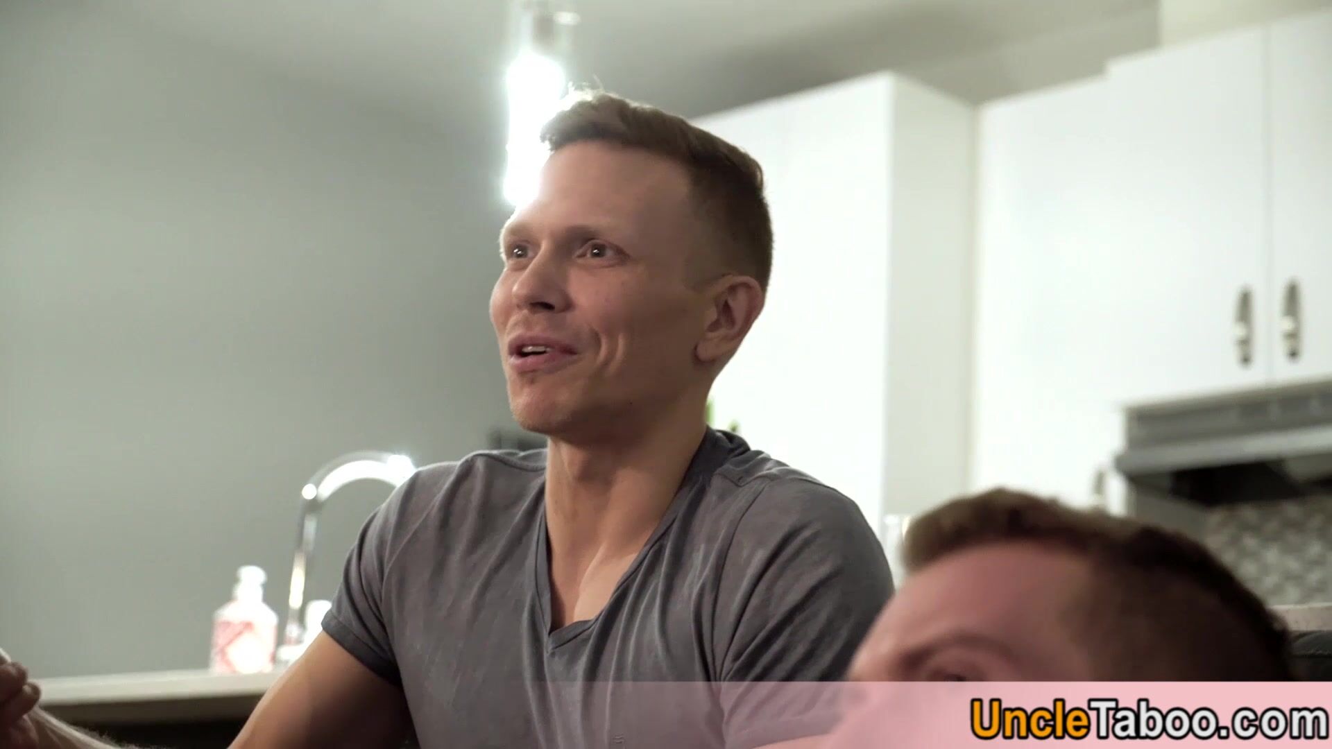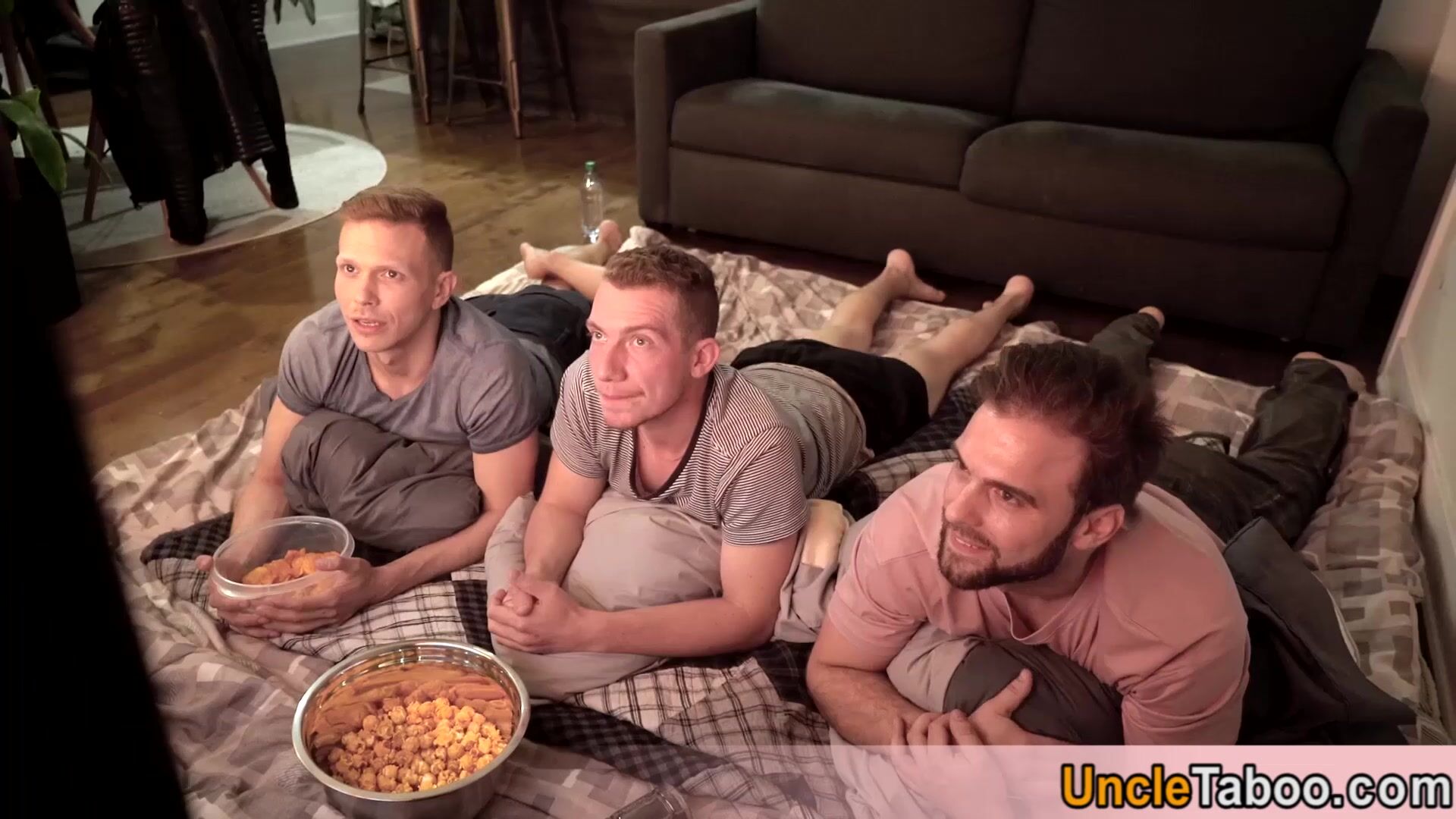 Blonde twinks Ethan Chase and William Moore watching a movie when their horny mate Gabriel Clark arrives and lures them into threesome fuck They sucking each others big dick then comes the hot bareback anal fuck