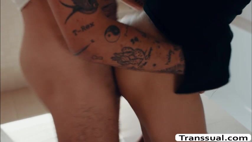 Busty milf shemale is fixing her self in the bathroom.Suddenly,she felts horny and start masturbating her shecock.After that,her stepson enters the bathroom and lets her suck his big cock passionately before he fucks her wet ass.