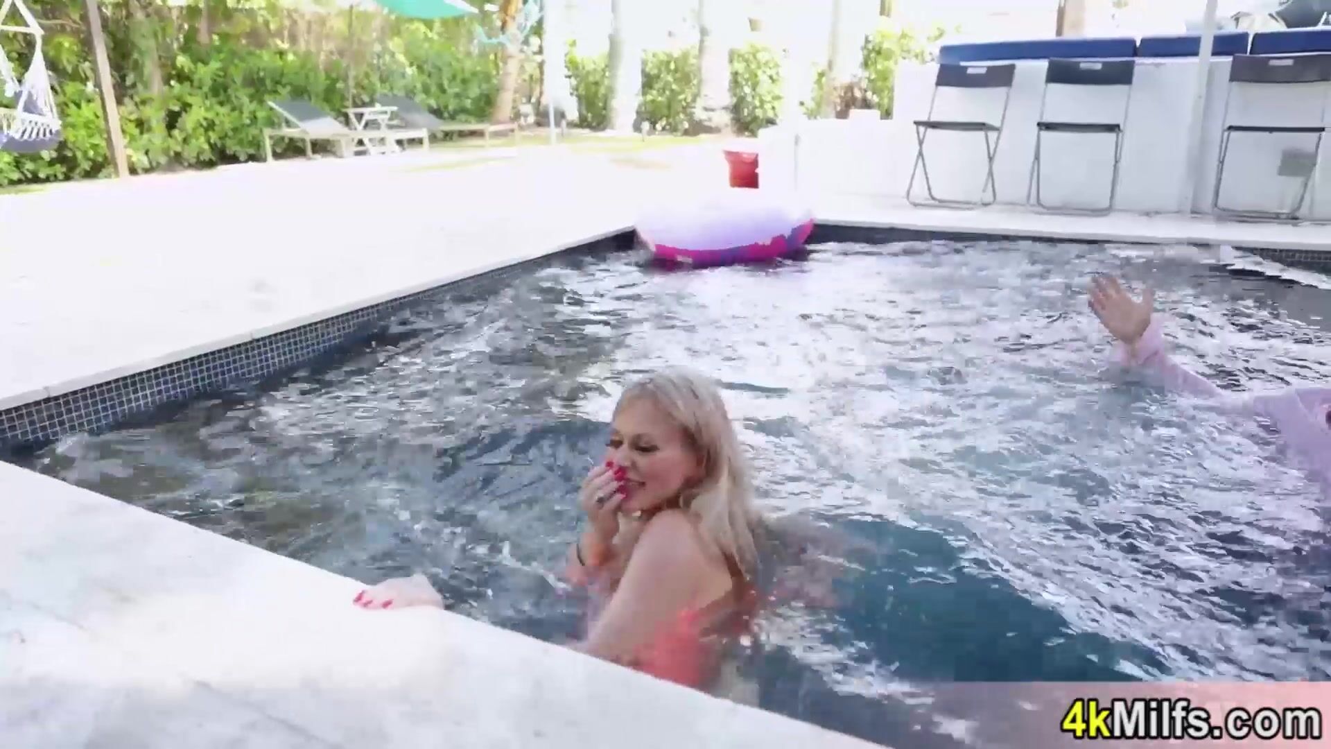 Hot blonde inked MILF Casca Akashova with massive fake tits caressing her shaved pussy by the pool Her BF comes and she is giving him a sloppy blowjob and titjob then the big cocked dude fucking her juicy cunt in doggystyle
