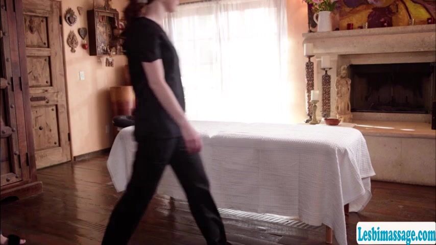 Busty bruntte arrives for her massage appointment,complaining about her back.She lets the hot masseuse massage her body while they are both naked.After that,they get horny and she starts licking the pussy of her masseuse.