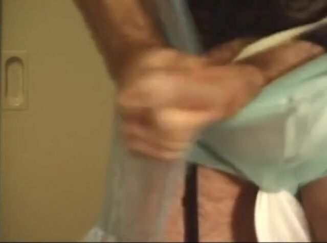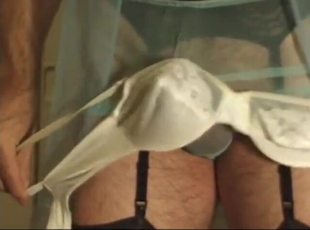 Wearing my vintage aqua pengoire and matching see through panties, can't decide which feels best for caressing my balls: vintage belted sanitary pad or silky white bra. What do you think?