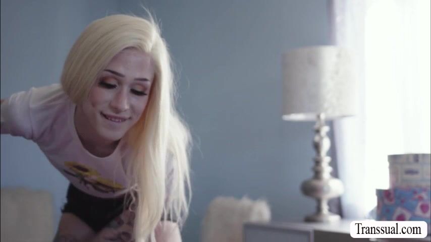 Blonde trans babe seduces the guy friend of her stepbro while he is out.She lets him stay in her room and they start kissing each other.After that,she throats his big cock passionately and in return,he fucks her wet ass o hard.