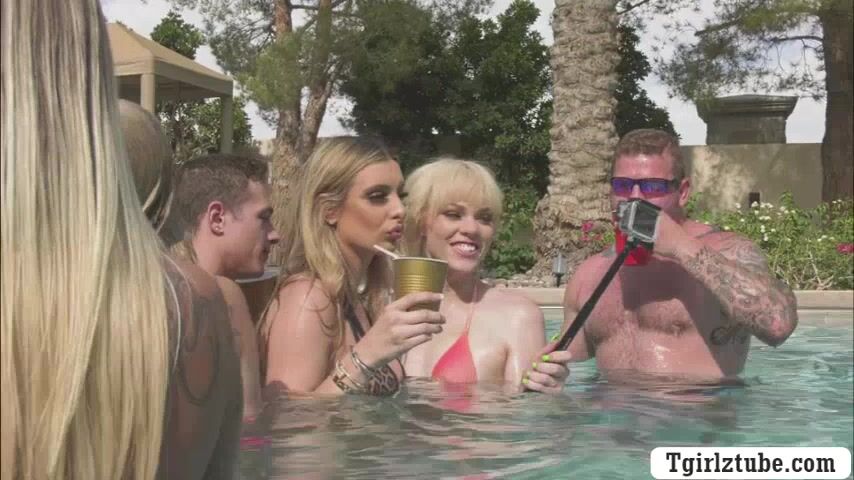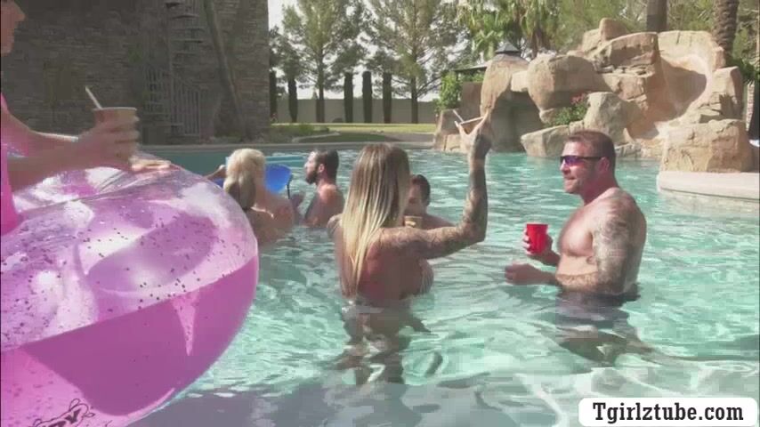 Busty shemales are in the swimming pool with many guys too.After that,they decide to do orgy and they start kissing each other.Next is,they suck their big cocks passionately and they let them bareback their wet ass too.