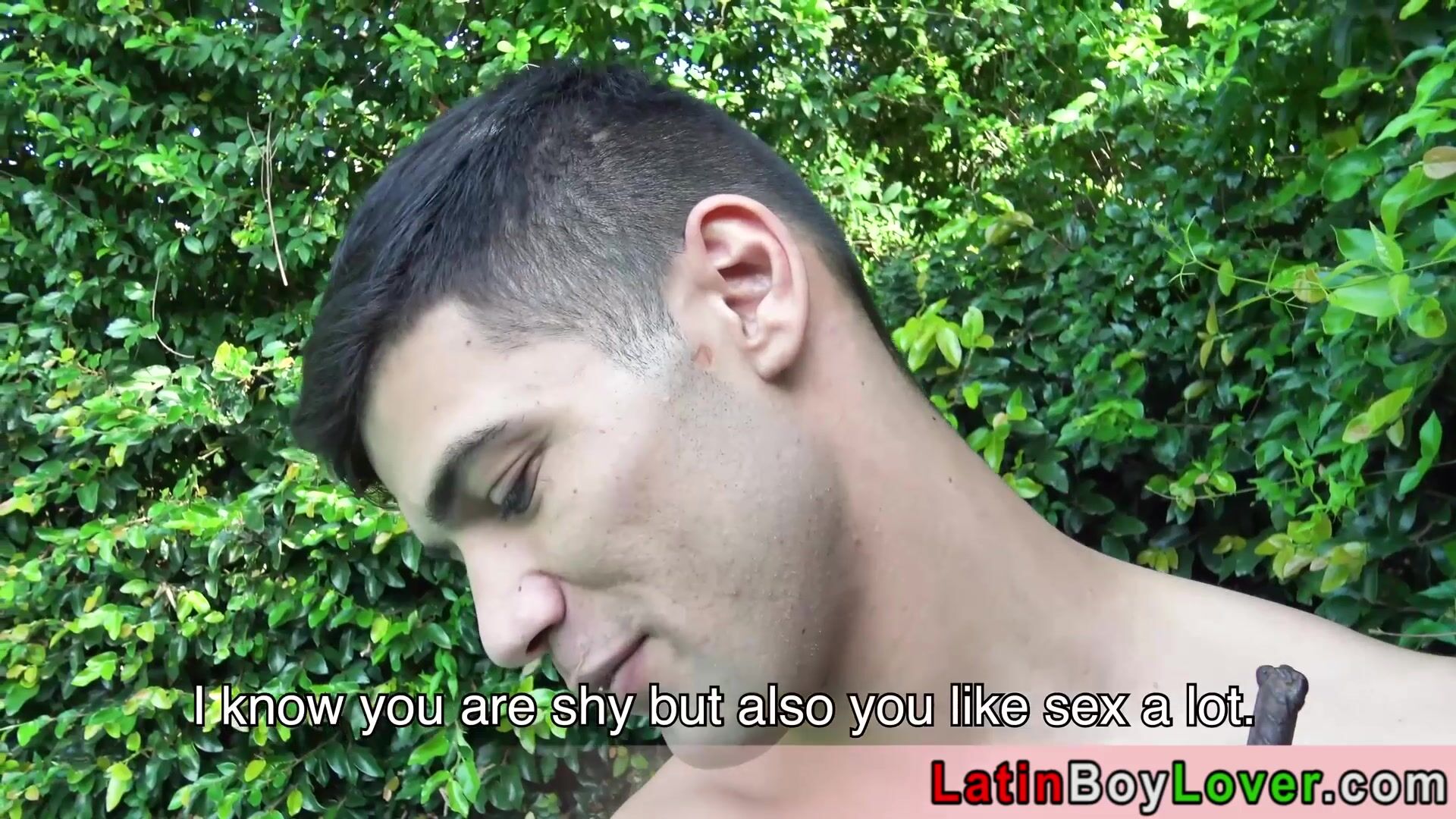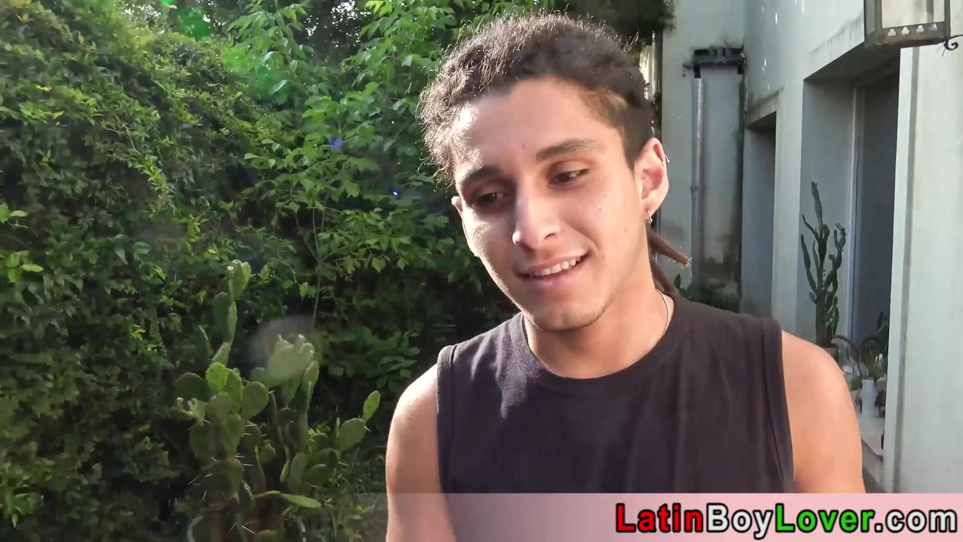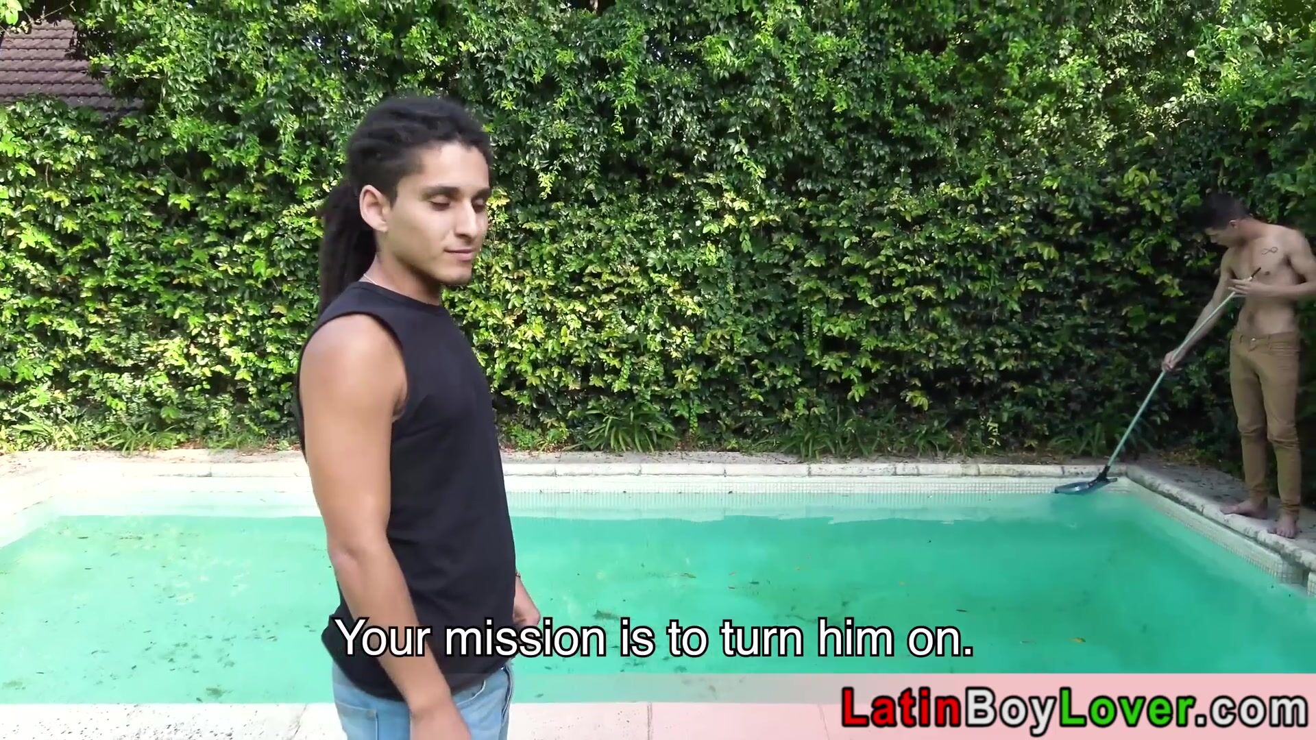 Hot amateur latin teen Gusty cleaning the pool when the gardener Cain comes a he cant resist his tanned body so he seduces him He is sucking his big dick then lets him to fuck him bareback outdoor
