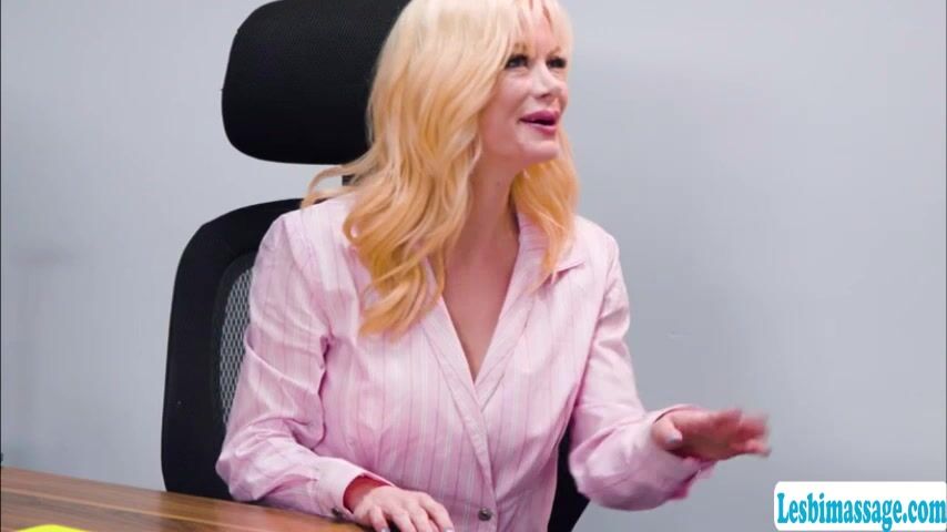 Milf blonde gives her beautiful secretary a shoulder massage because she looks so tired.After that,her hands slowly touching her secretarys tits and they kiss each other passionately.Next is,she lets her secretary bend over and she then licks her pussy