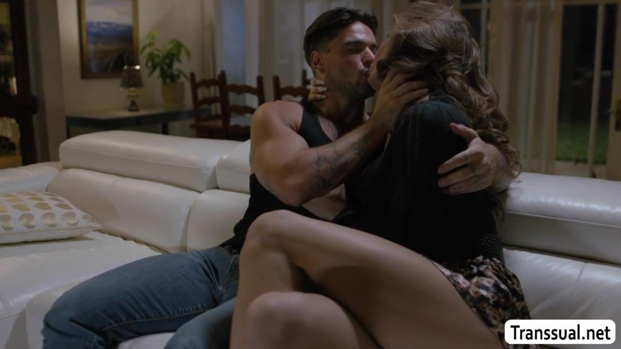 Busty shemale caught her guy neighbor in her backyard and instead of getting mad,she lets him in and they start kissing each other on the couch.Next is,she throats his big cock passionately and in return the guy, fucks her wet ass so hard.