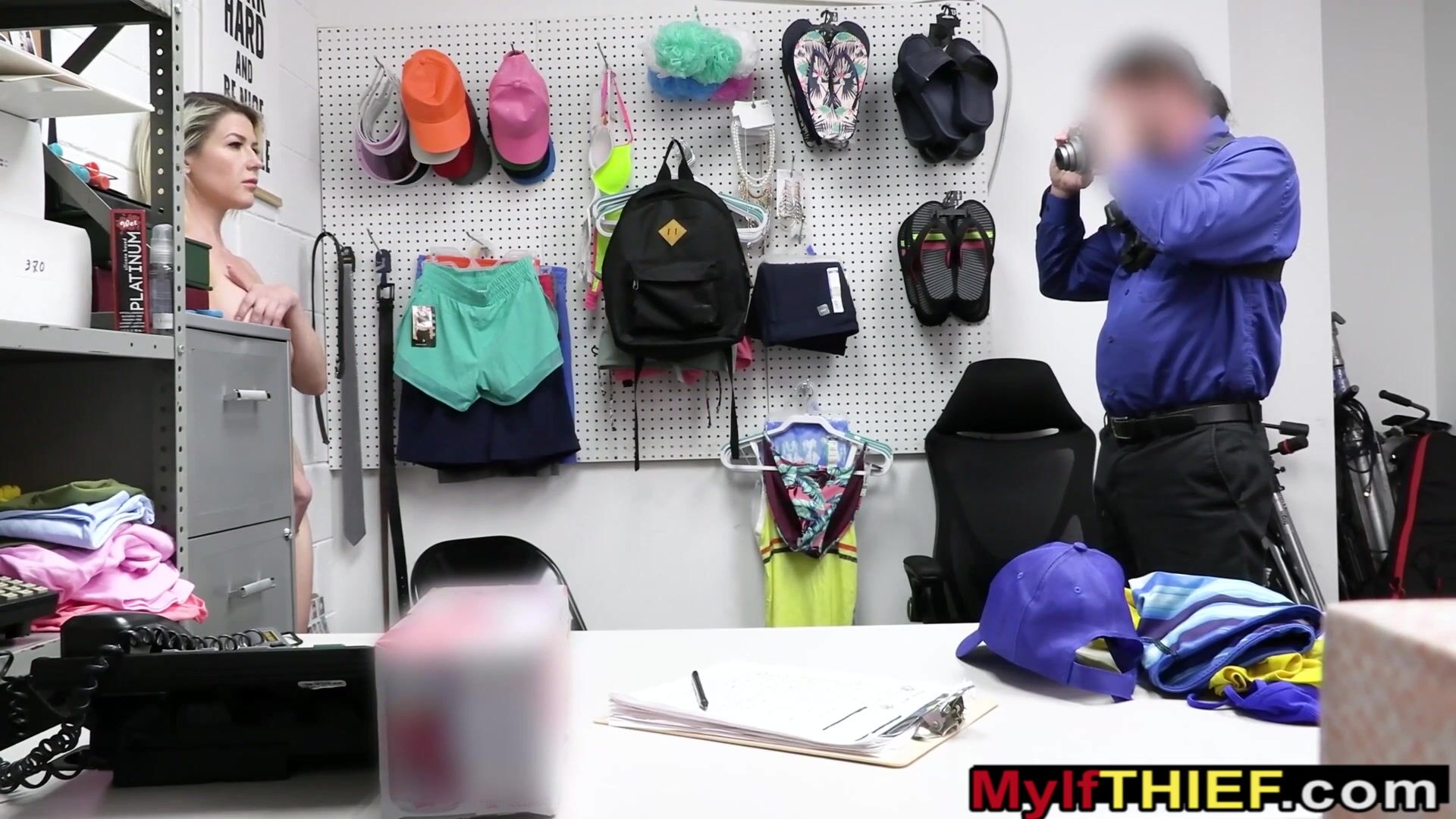 Securitiy guard catches blonde MILF Kit Mercer stealing beer and takes her into custody Although she is apologetic there is only one way to pay for the crimes