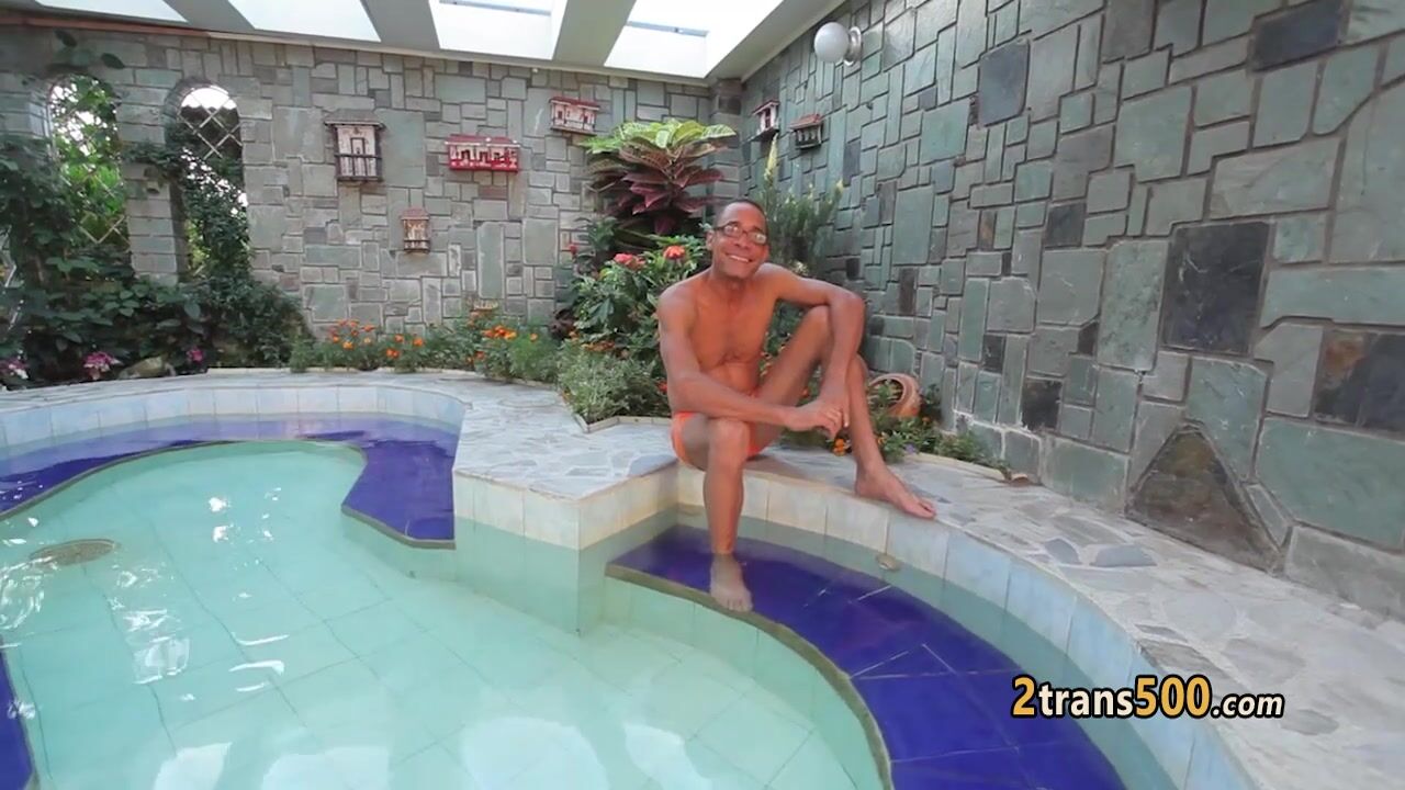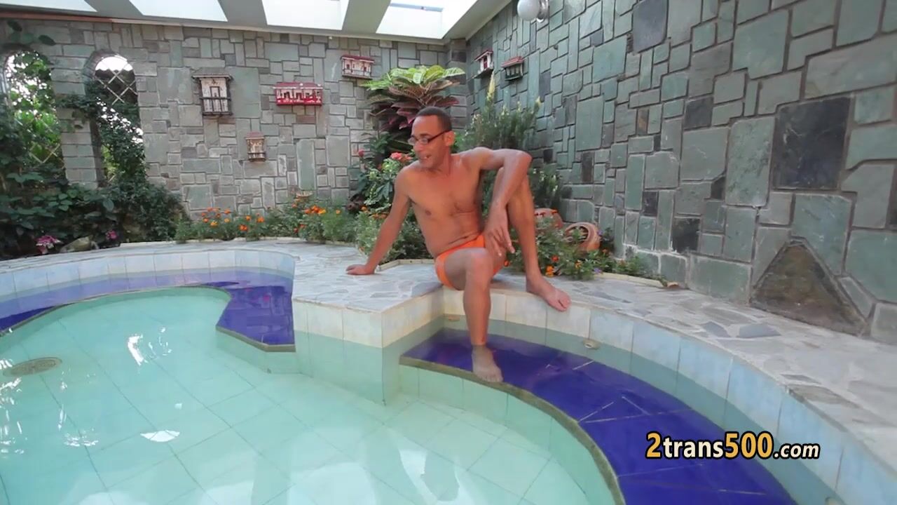 Horny shemale slut with tattoos and giant ass sucked guys massive cock then enjoyed his cock banging her tranny ass hole so hard by the pool
