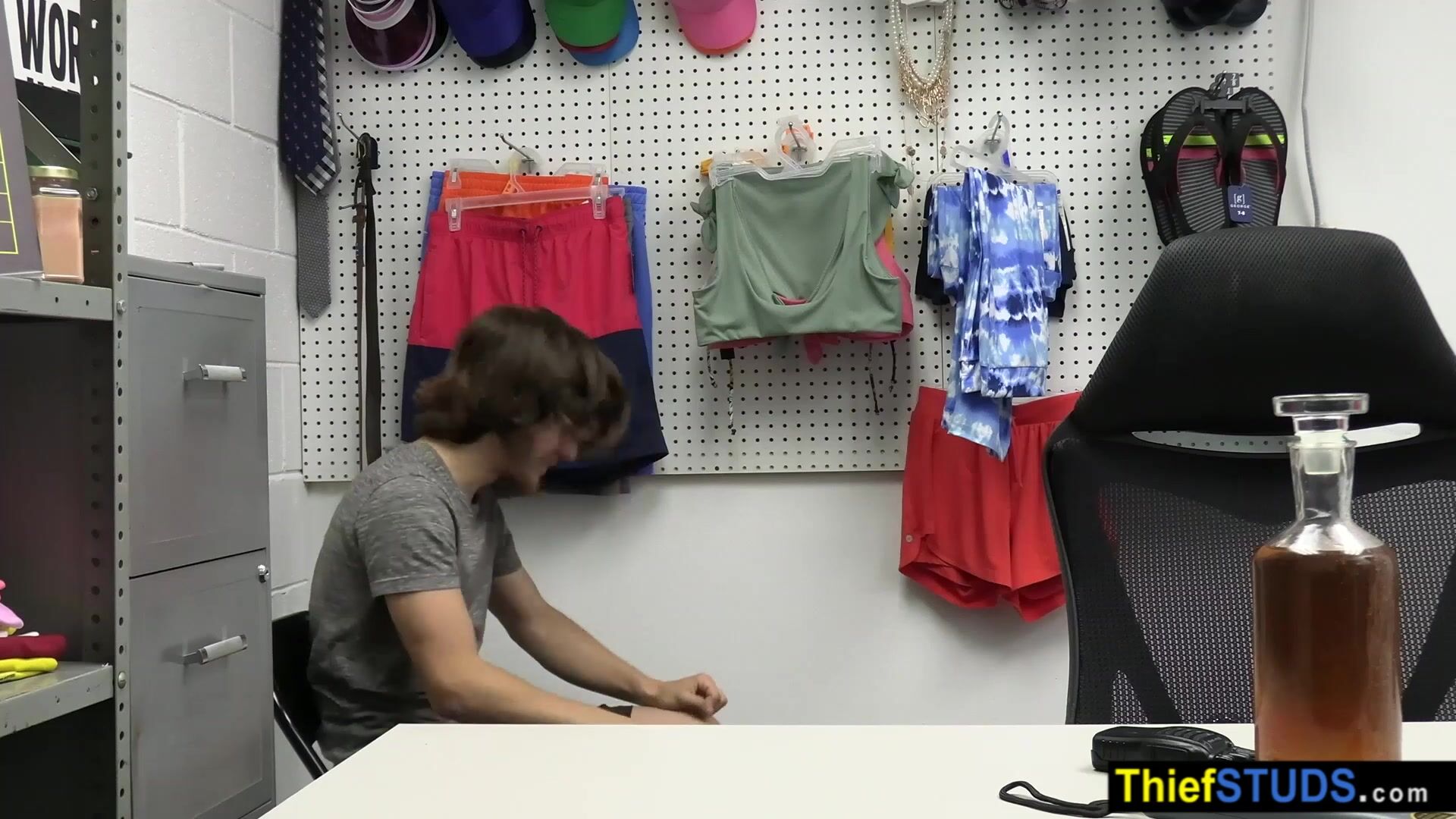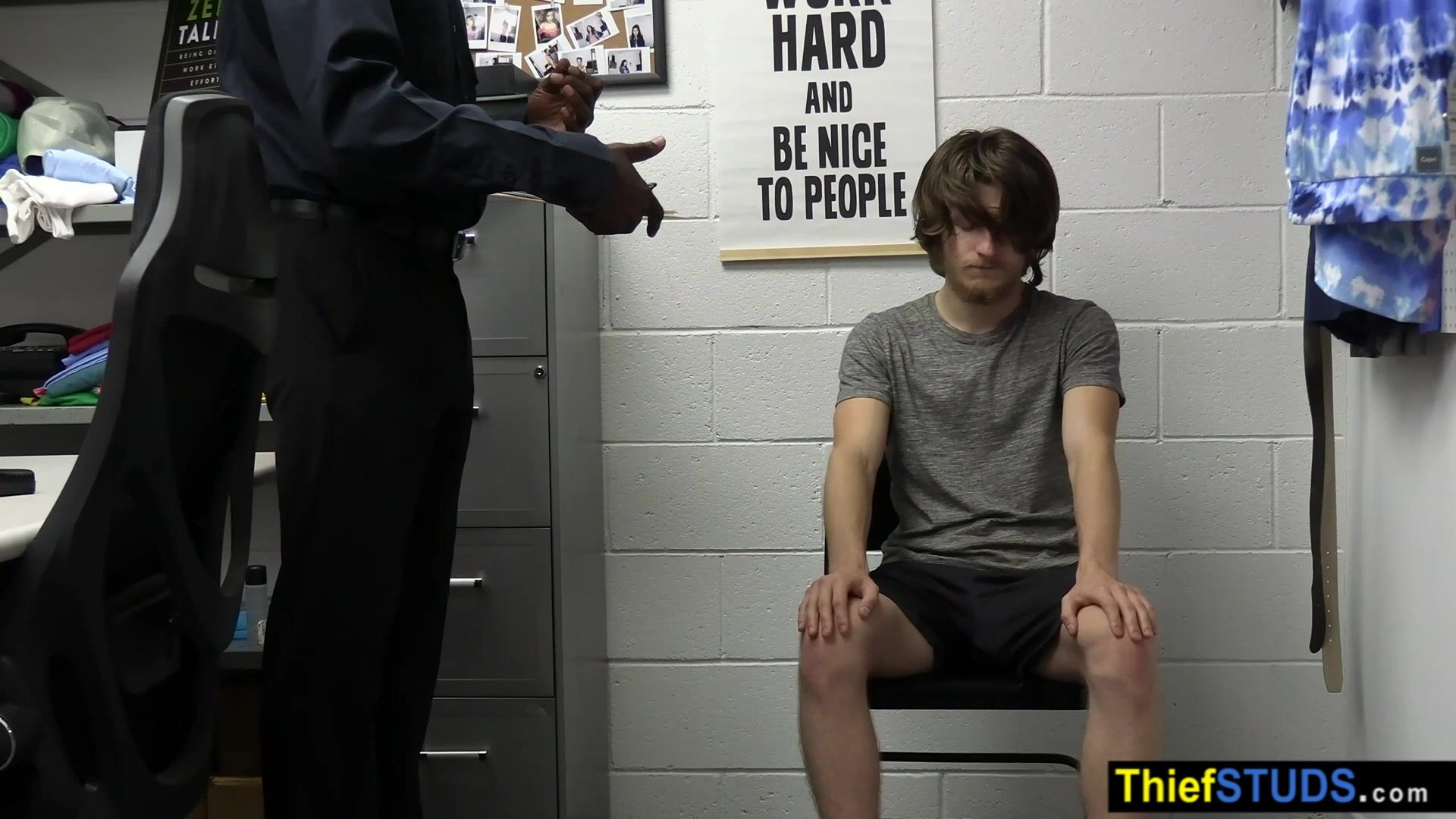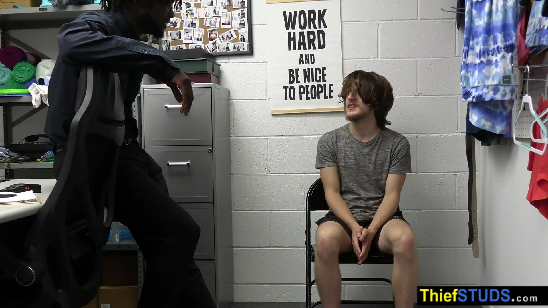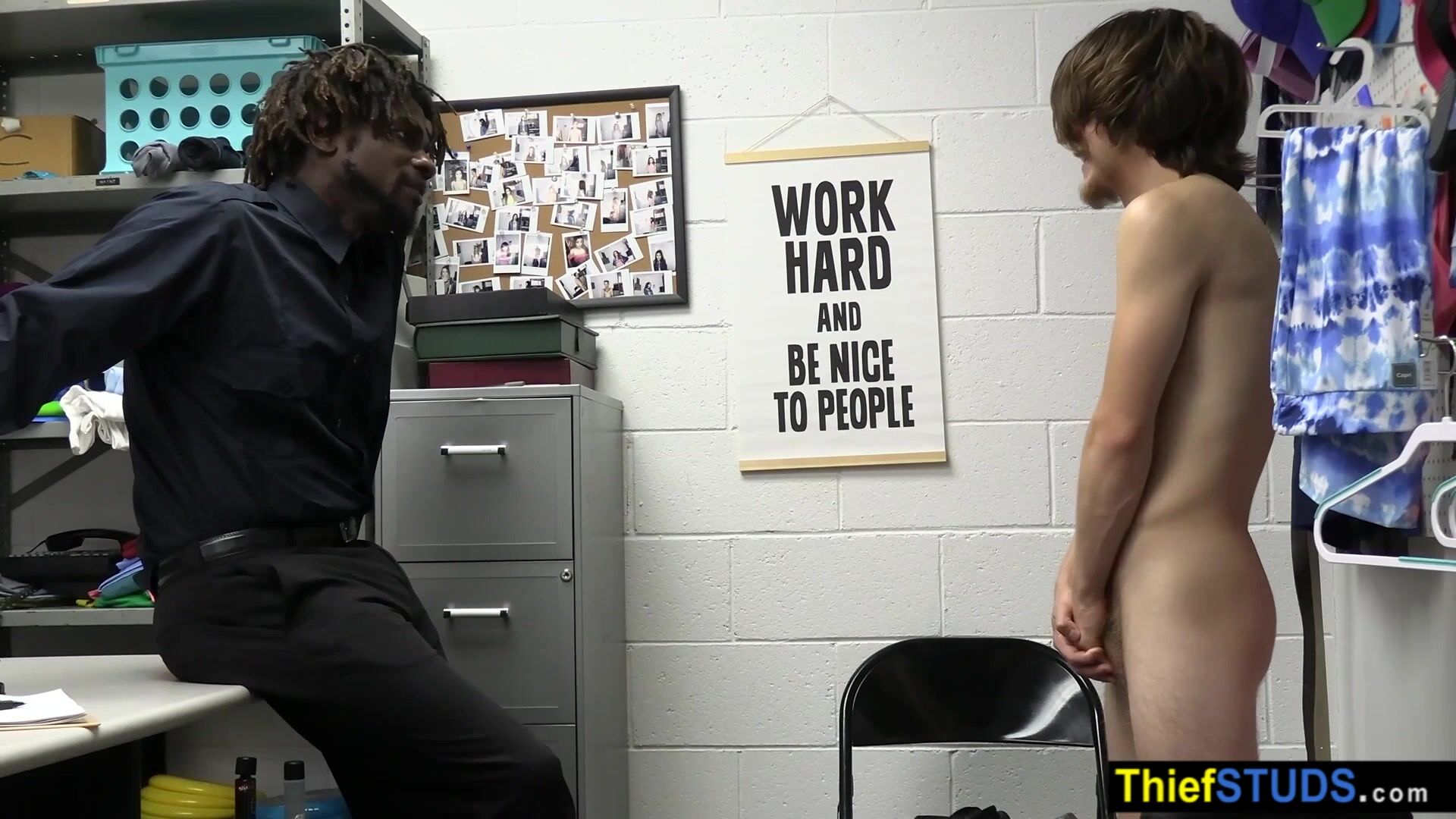 BBC security guard Devin Trez suspects teen perp Troy Harlow of trying to steal so he brings him to the backroom for further questioning He ordering him to suck his big black cock then he fucking his white ass bareback to teach him the rules