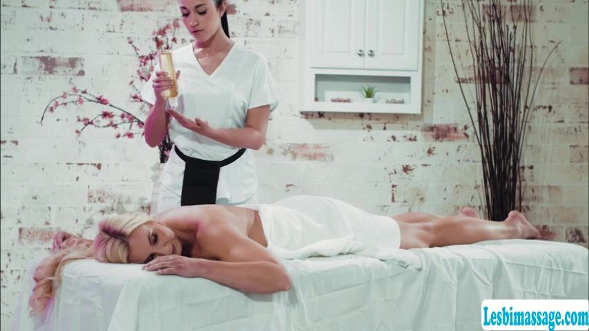 Brunette masseuse welcomes her milf client and she lets her get naked and start massaging her body passionately.After that,she gets horny and she then starts rubbing the pussy of her client and licks it after.
