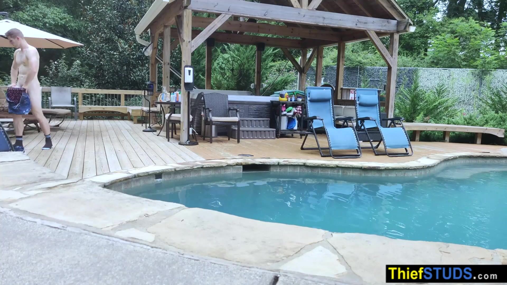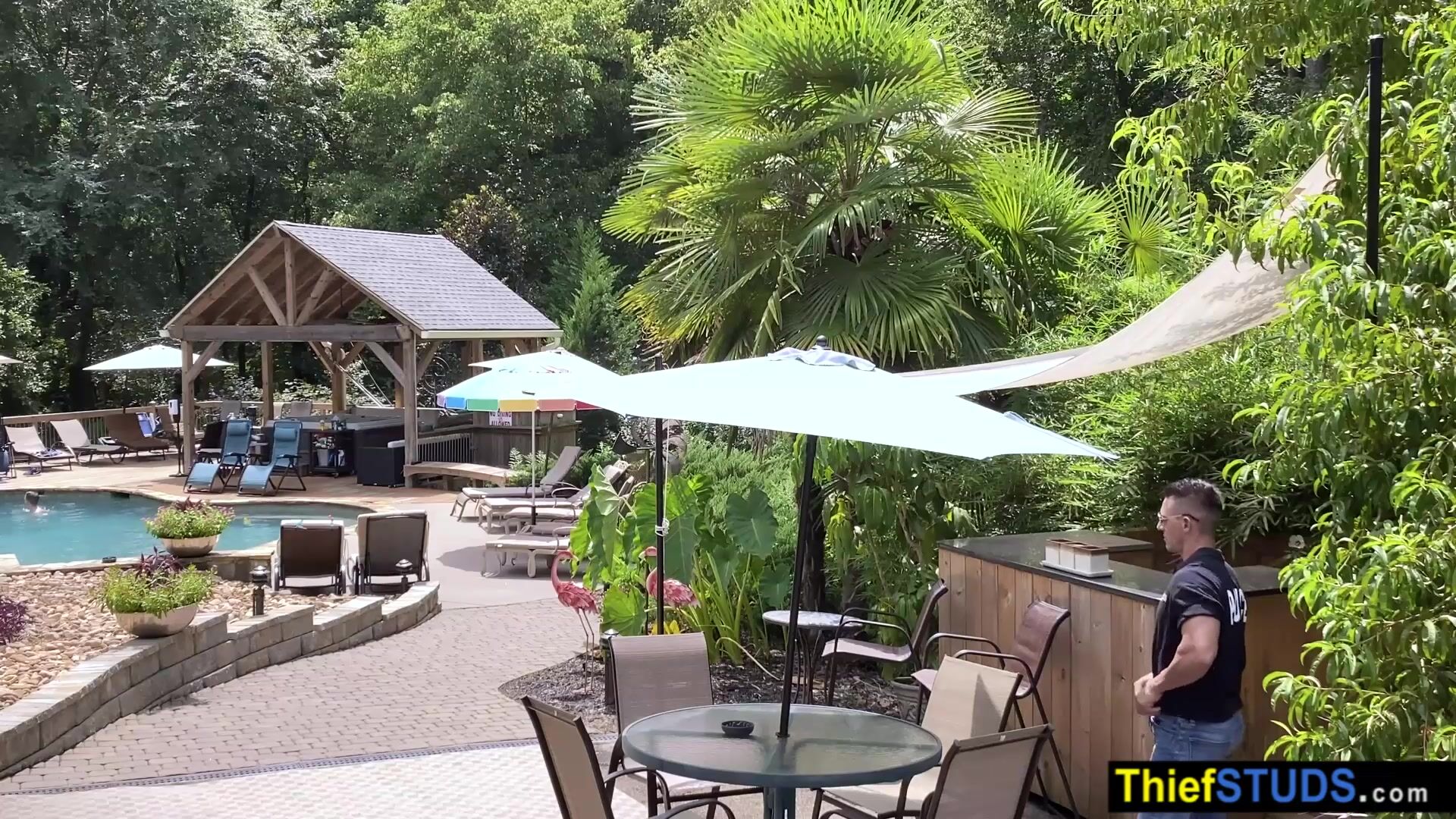 Security guard catching and fucking a teen perp in the pool