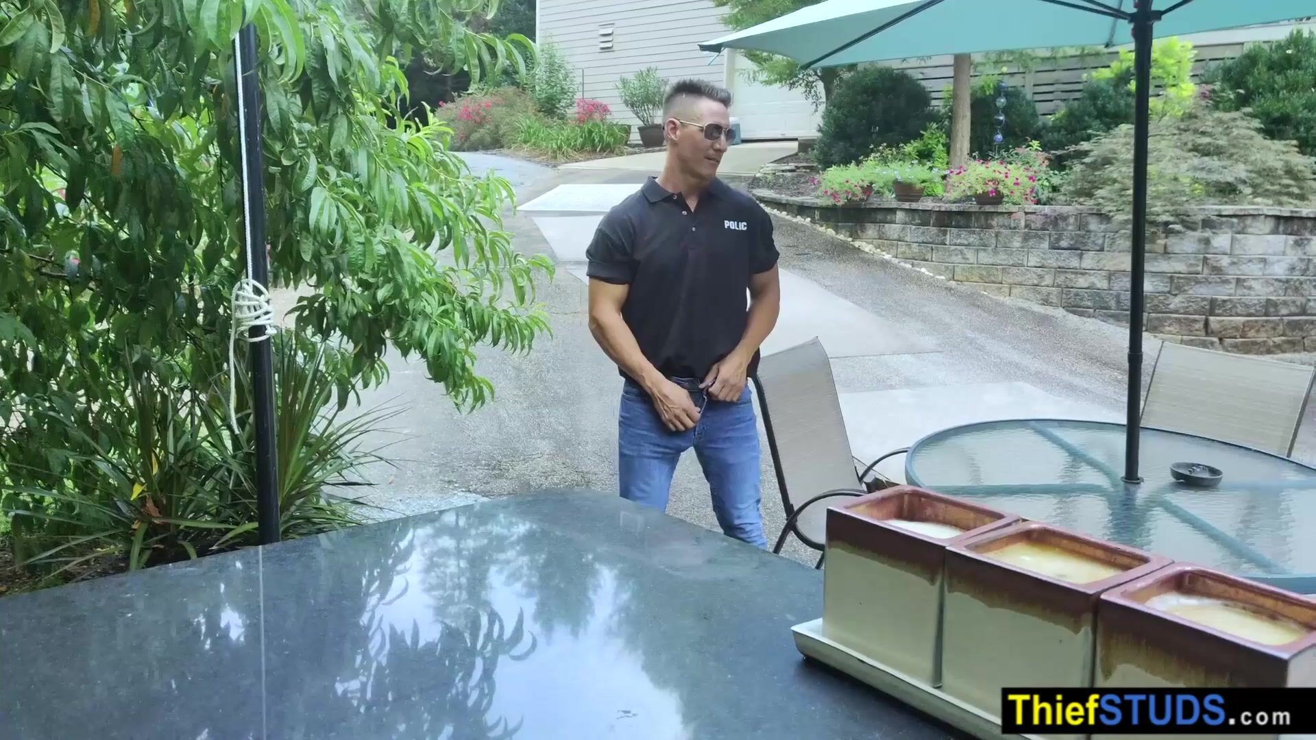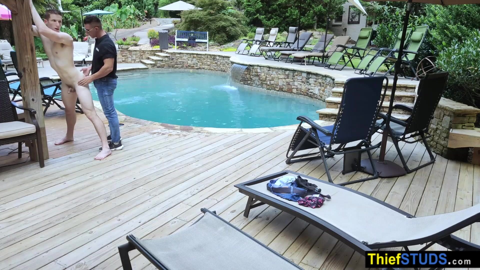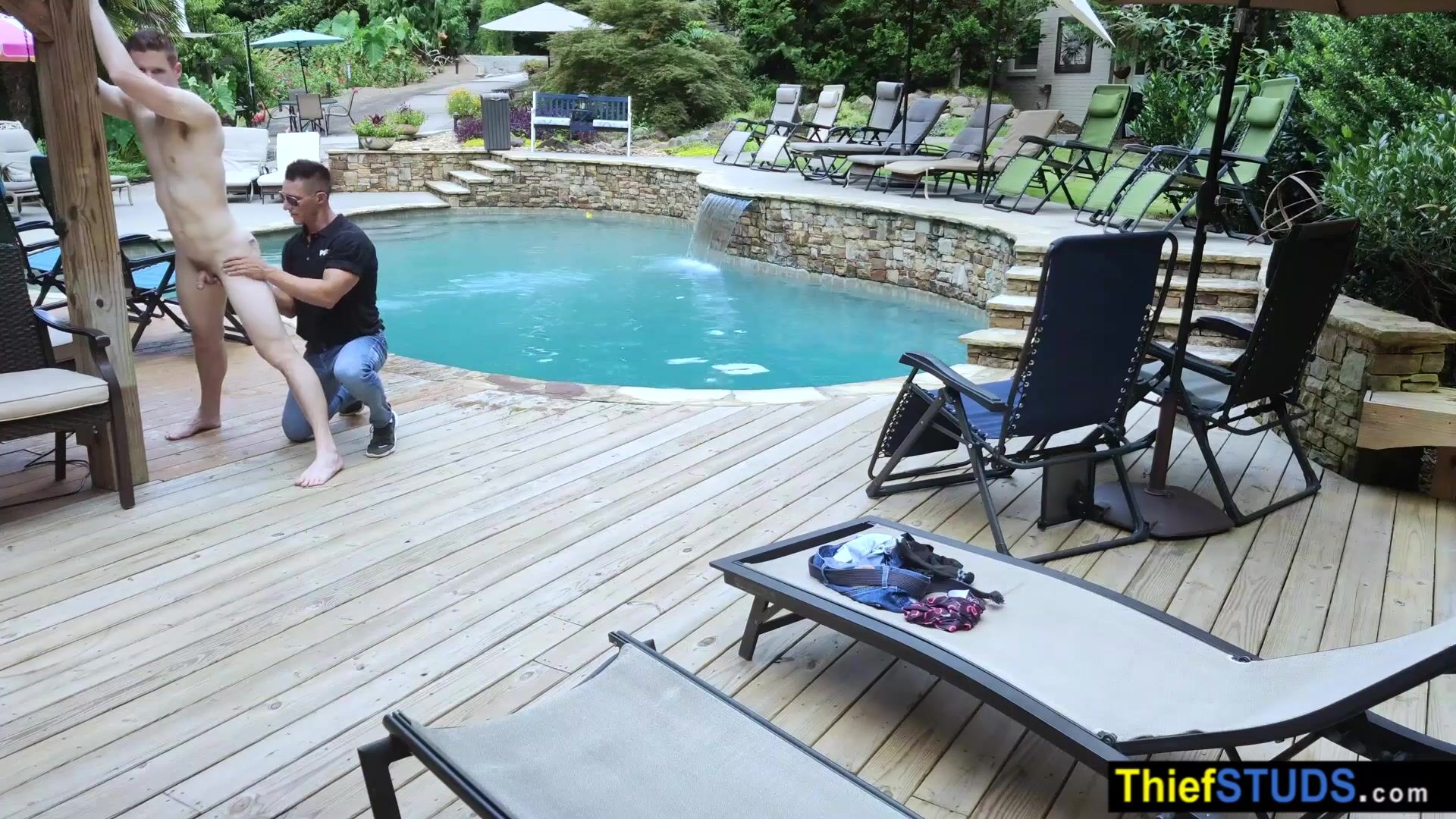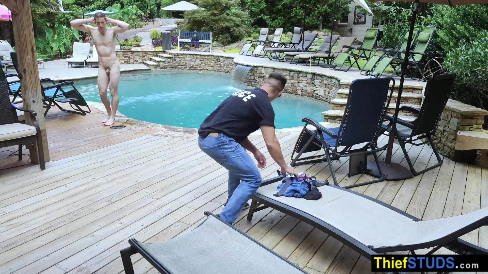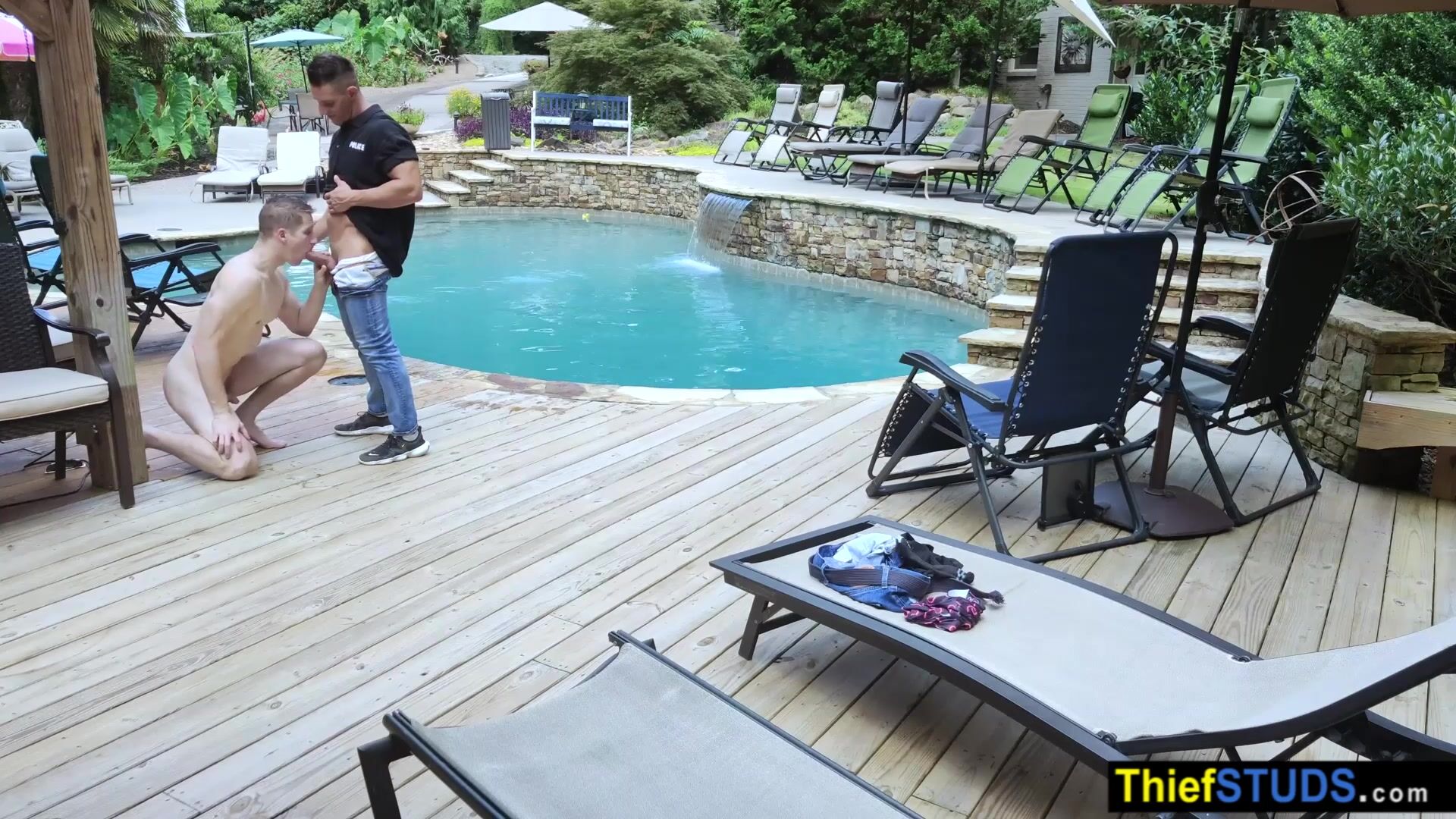 Security guard Jax Thirio spots teen perp Aiden Asher sneaking into the pool and skinny dipping When he confronts him he submits him to a thorough cavity search then ordering him to suck his big cock then fucking the muscle studs bareback outdoor