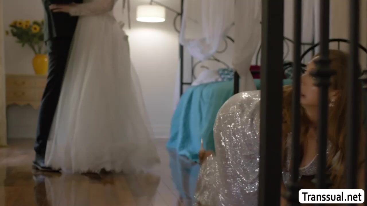 Blonde shemale bride and her soon to be husband get horny and start kissing each other in their room.After that,smalltits TS sucks the hard big cock of her soon to be husband passionately.In return,the dude fucks the wet ass of trans bride.