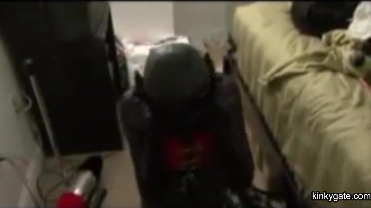 My latex slut has to make every effort to free herself, while I watch her wrestling.
