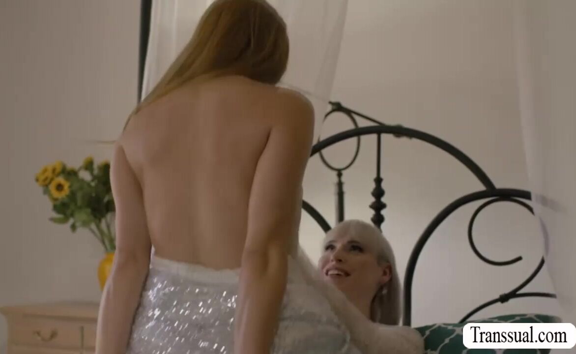 Bride shemale is ready on her wedding and her busty brides maid take a picture with her.After that,they get horny and start kissing each other.Next is,big tits brides maid throats the tranny cock of brides TS and lets her fuck her wet pussy after.