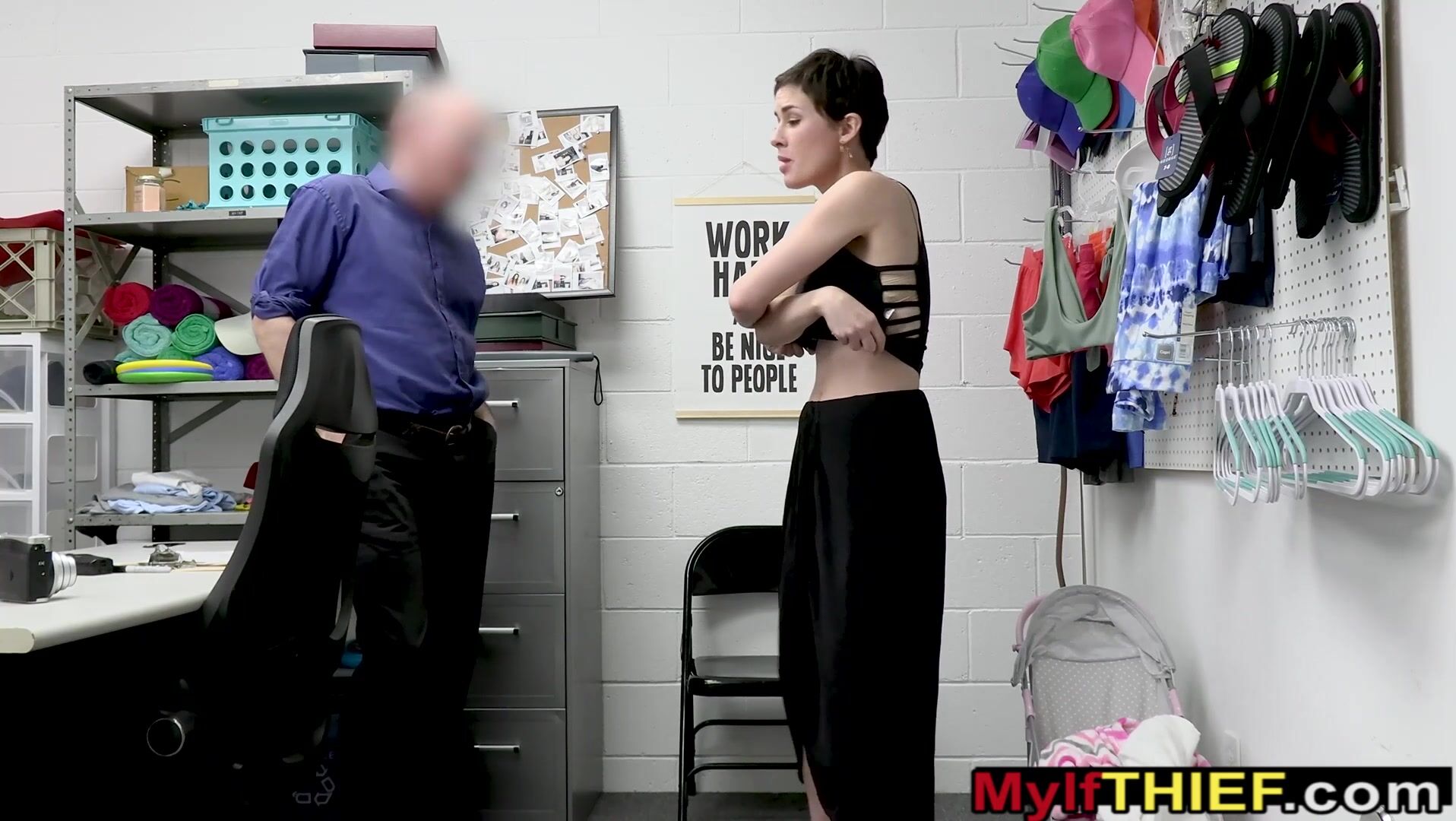 Short haired brunette MILF thief Olive Glass with big natural tits got caught and strip searched by a dirty LP officer who ordered her to suck his big cock then he fucked her hairy pussy hard on CCTV