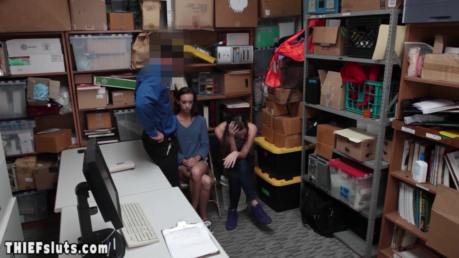 Skinny brunette arrogant teen shoplifter Charity Crawford with small tits and her GF Zoey Laine got caught by a dirty LP officer who ordered them to suck his big dick then he fucked the petite sluts hard