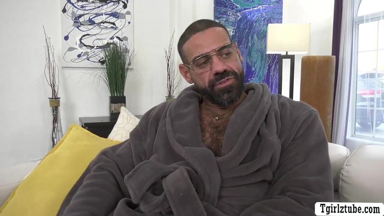 Horny boss jerking off while watching his shemale babysitter jerking off her tranny cock too.After that,busty Tgirl throats his hard cock passionately and in return,her boss barebacks fuck her tight wet ass so deep and hard.