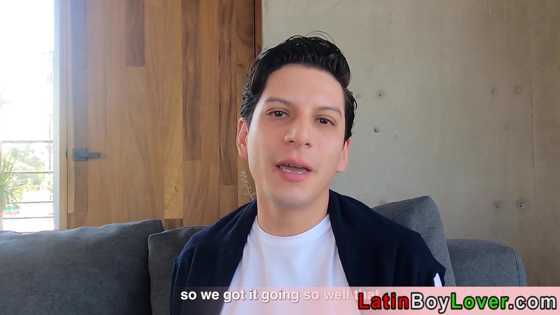 Cute faced amateur latin twink with big cock is sucking a hard dick then he hops onto it for a bareback anal ride during their mate masturbating next to them